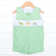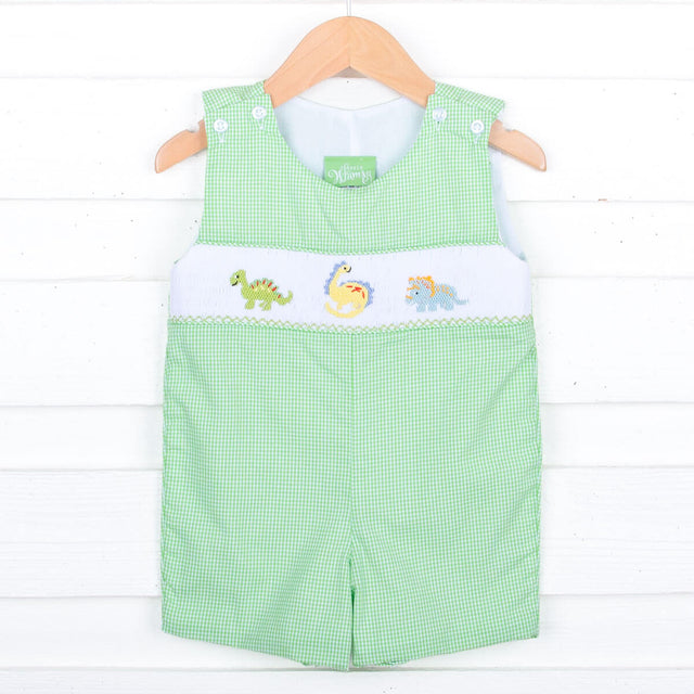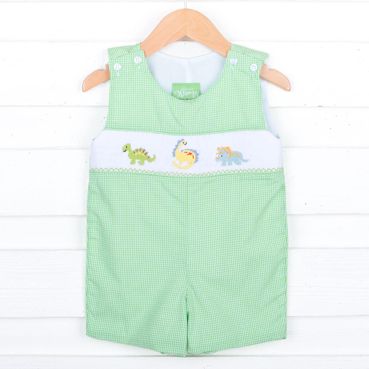 This Dinosaur Smocked Jon Jon is totally rawr-some! Featuring hand-smocked dinosaurs on green gingham, this Jon Jon has shoulder buttons and snaps in stride. It's the perfect outfit for playdates, birthdays, photoshoots, or any occasion.