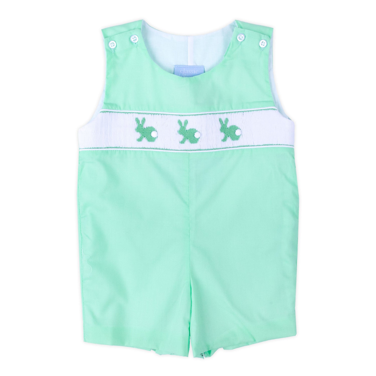 Get your little one ready for an Easter egg hunt or a special day at church with our Easter Bunny Smocked Green Gingham Jon Jon. This sweet green gingham Jon Jon features delicate smocked green bunnies for an extra touch of charm. Designed with shoulder buttons and snaps in stride for easy changes. Perfect for making Easter memories, this outfit will have your little one looking picture-perfect for the season