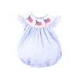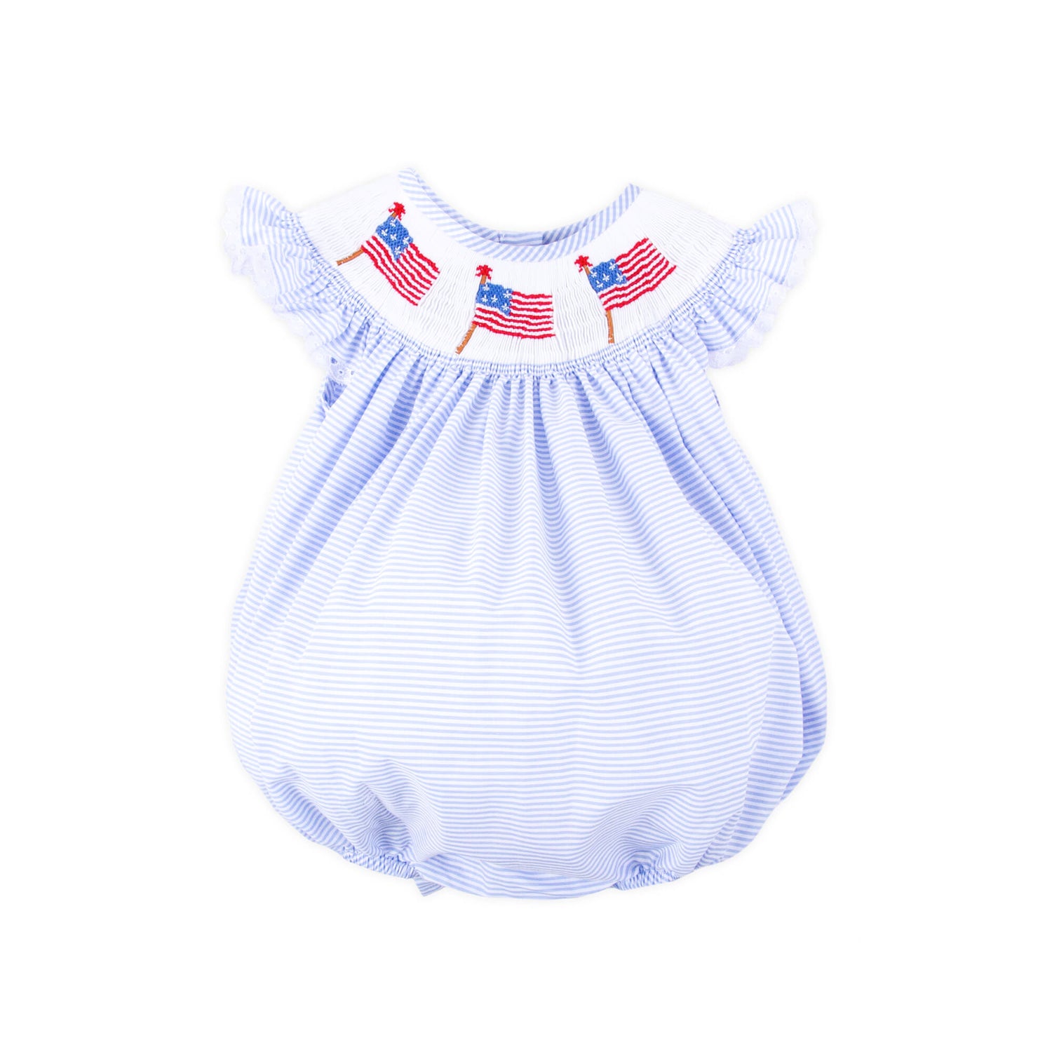 This Flag Smocked Light Blue Stripe Angel Sleeve Bubble is the perfect patriotic outfit for watching fireworks and enjoying a 4th of July cookout. Designed from light blue stripe fabric, this bubble features charming smocked American flags and angel-style sleeves adorned with white lace trim. Snaps in stride for easy changes.