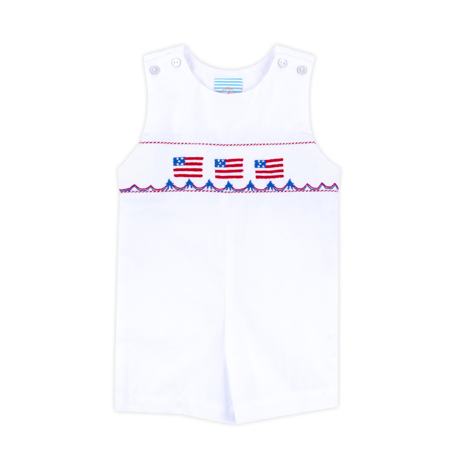 This Flag Smocked White Jon Jon is the perfect patriotic outfit for watching fireworks and enjoying a 4th of July cookout. Designed from solid white fabric, this Jon Jon features charming smocked flags. With convenient shoulder buttons and snaps in stride, dressing your little one is a breeze.