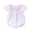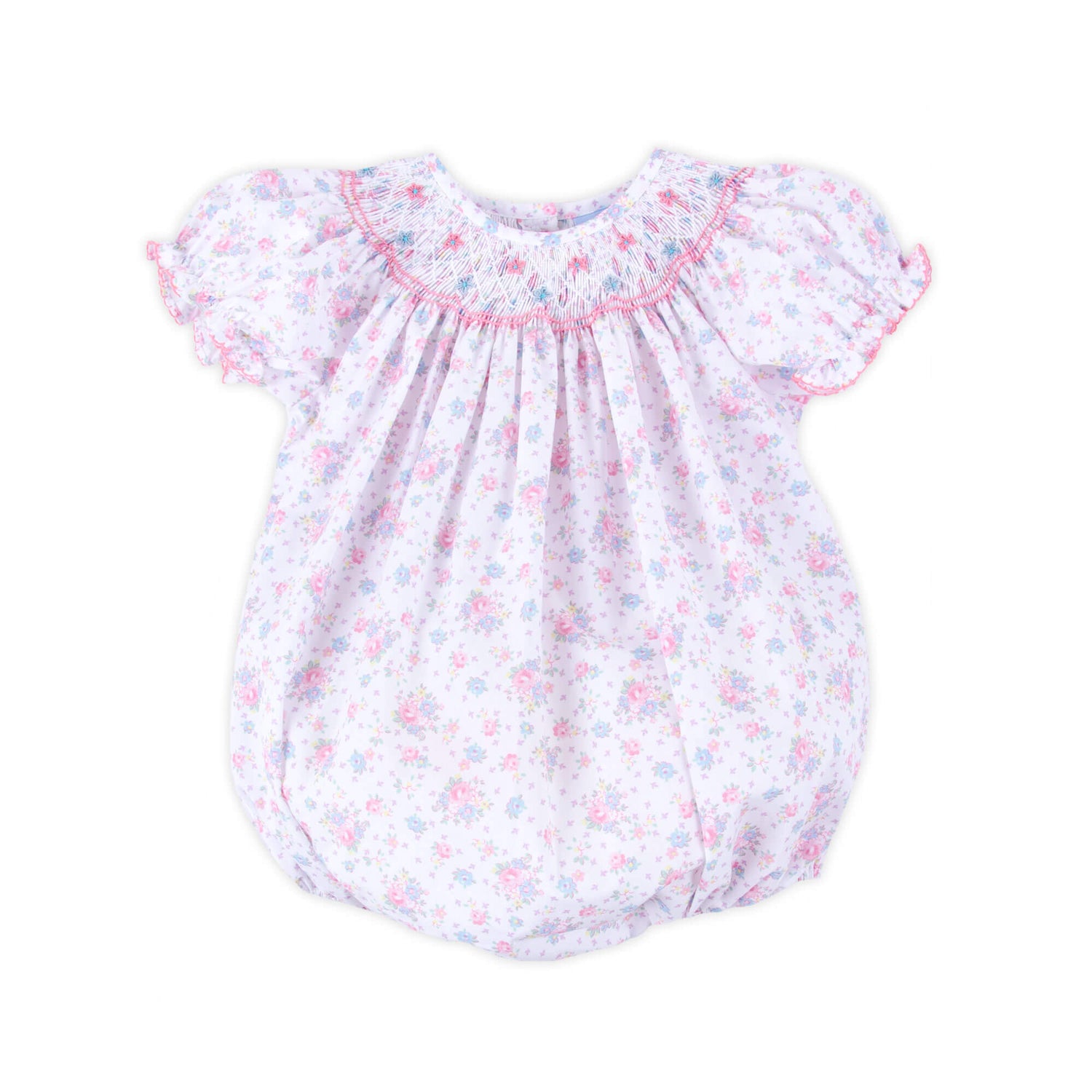 This Floral Blooms Pink Smocked Bishop Bubble is elegantly adorable for spring season! Featuring a charming floral print, exquisite geometric smocking, and bishop-style sleeves adorned with a pink picot trim. Snaps in stride for easy dressing.
