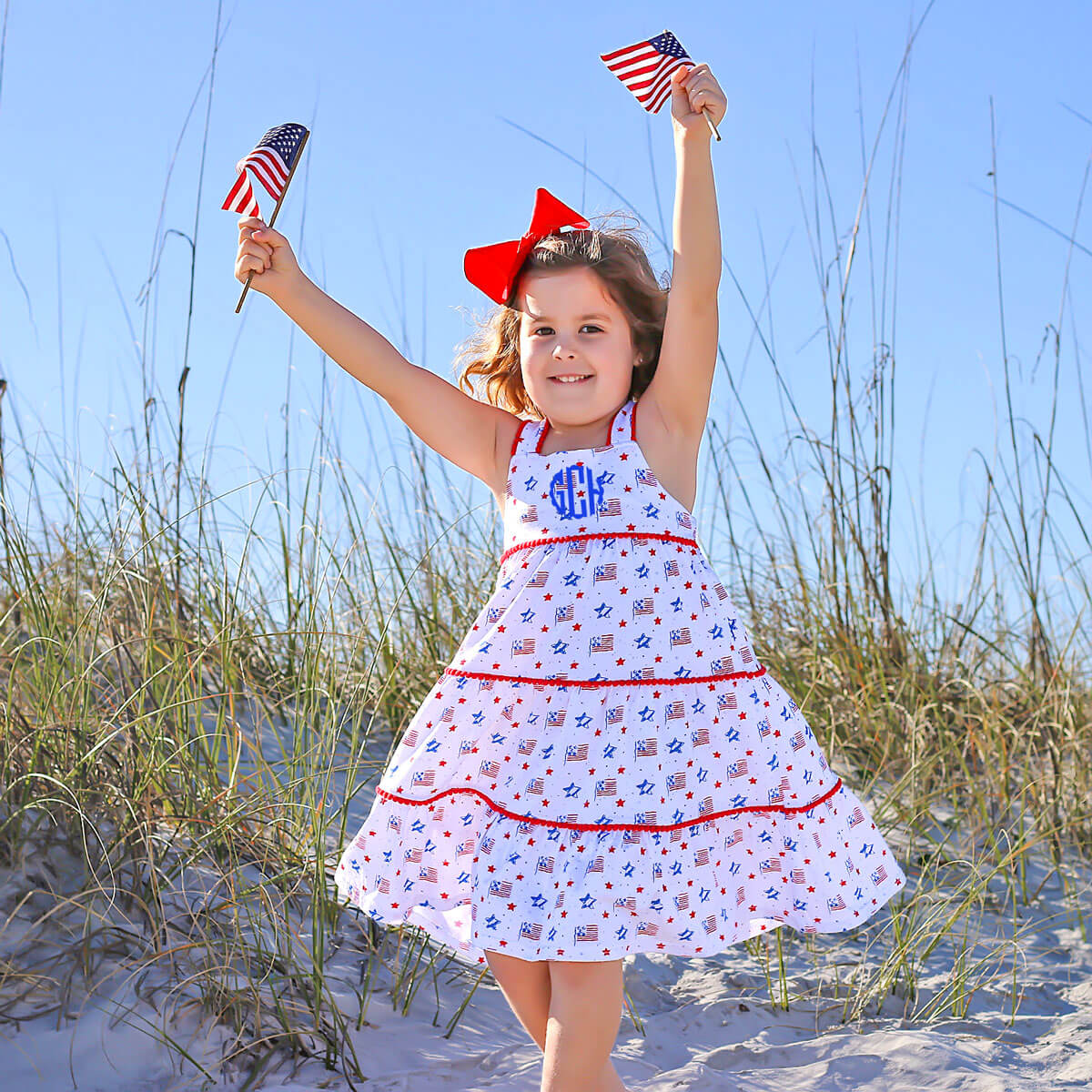 This Flag Print Callie Dress is the perfect patriotic outfit for watching fireworks. The Callie-style dress in a patriotic print features cross-back straps with red pom-pom trim. Make it uniquely yours by adding a monogram!