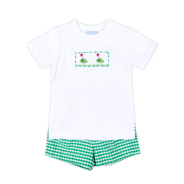 Make a stylish statement on a summer day at the course with our Golf Pin Green Gingham Boy Short Set! The white knit shirt features charming hand-smocked golf pins, perfectly paired with green gingham waistband shorts for a classic and sporty look.