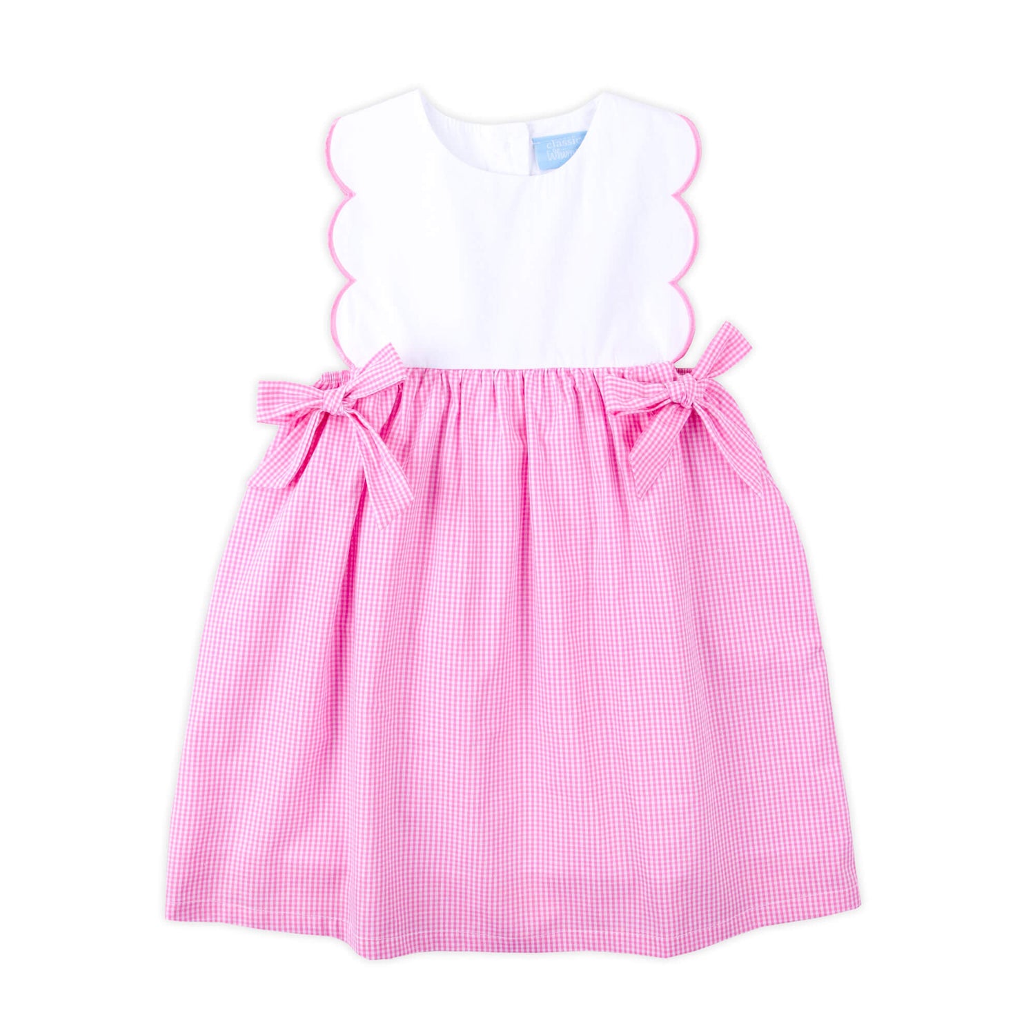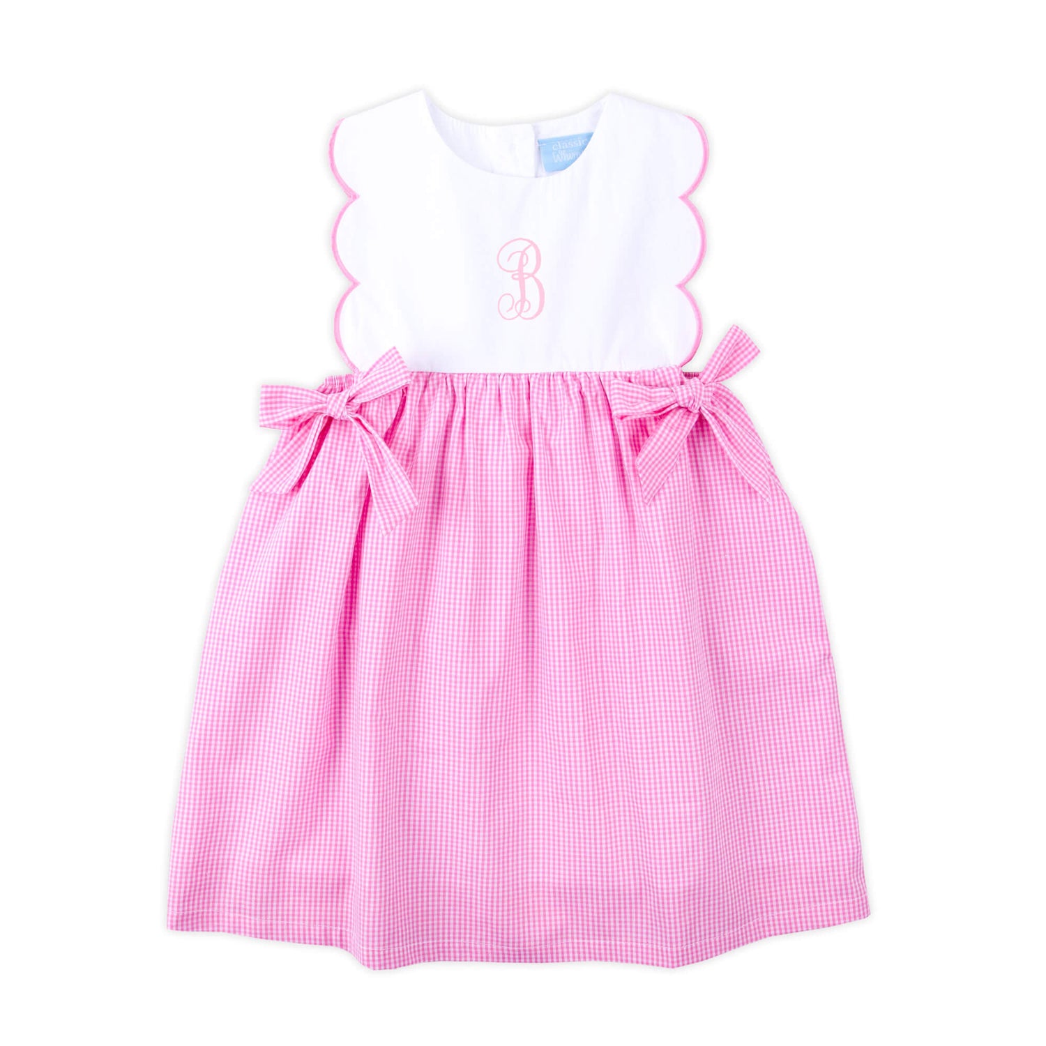 This Hot Pink Gingham Scalloped Bib Dress is a stylish and comfortable choice for any sunny day. The sleeveless design features a charming pink gingham print, a scalloped white bib, and sweet side tie bows. Add a monogram for a personalized touch!