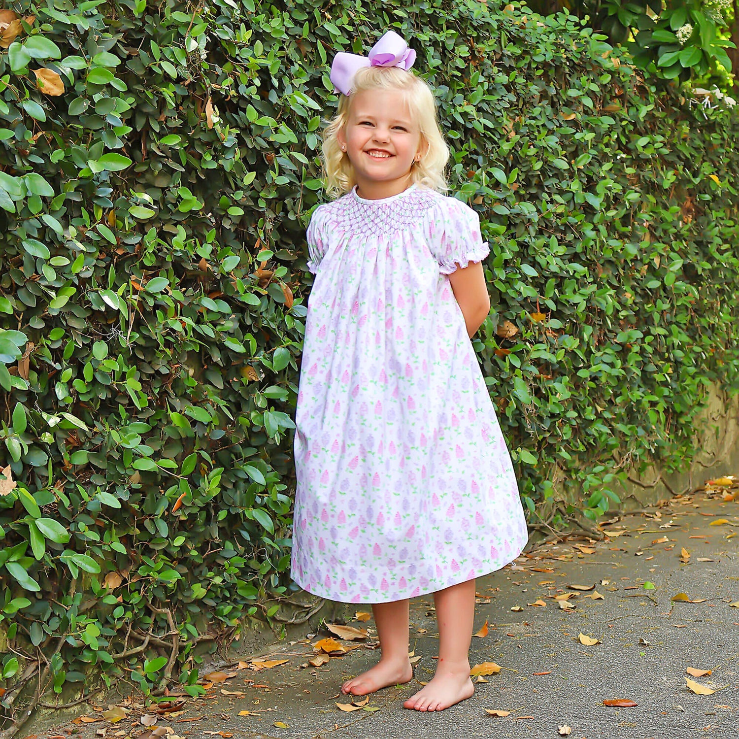 This Hydrangea Floral Lavender Smocked Bishop Dress is elegantly adorable for spring season! Featuring a charming pink and lavender print, exquisite geometric smocking, and bishop-style sleeves adorned with a lavender picot trim.