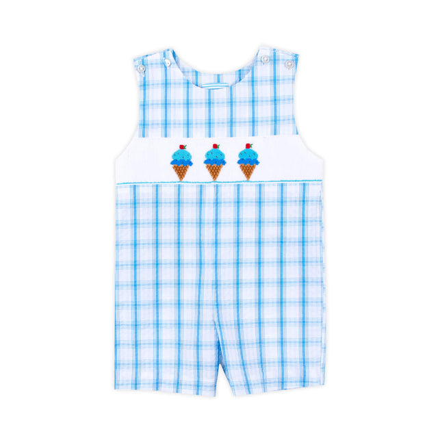 Summer is here, and your little one will look absolutely adorable in our Ice Cream Scoops Smocked Turquoise Plaid Jon Jon! This sweet turquoise plaid Jon Jon features charming smocked ice cream cones, shoulder buttons, and snaps in stride for easy changes. A must-have for sunny adventures and sweet celebrations!
