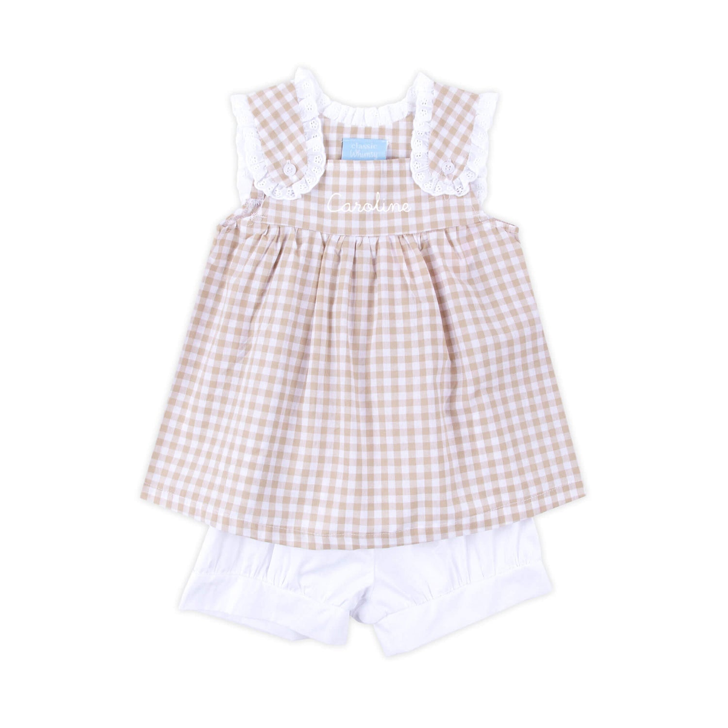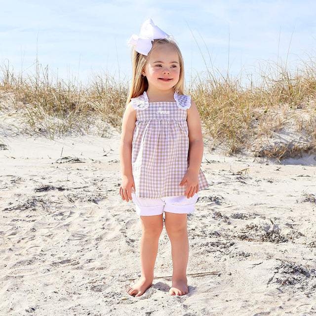 Your little girl will look absolutely darling in the Khaki Gingham Lulu Short Set! This charming Lulu-style top features classic khaki gingham and wide ruffle straps, perfectly paired with coordinating white bloomer shorts. Add a monogram for a personalized touch! Perfect for beach portraits or any spring and summer occasion, this sweet and comfy outfit is one she’ll love to wear again and again.