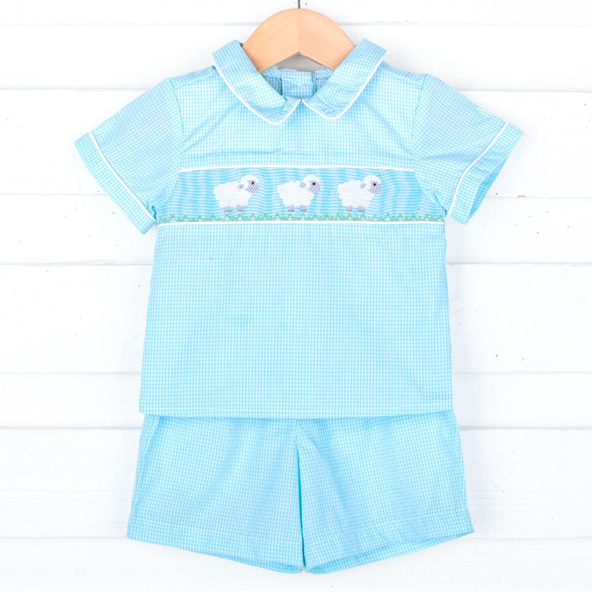 Get your little one ready to celebrate Easter Sunday in our Baby Lamb Mint Smocked Collared Short Set! This delightful mint gingham short-sleeve shirt is adorned with precious smocked lambs, adding a touch of springtime charm. Paired with matching mint gingham shorts, it’s the perfect outfit for church, family gatherings, and all your Easter festivities!