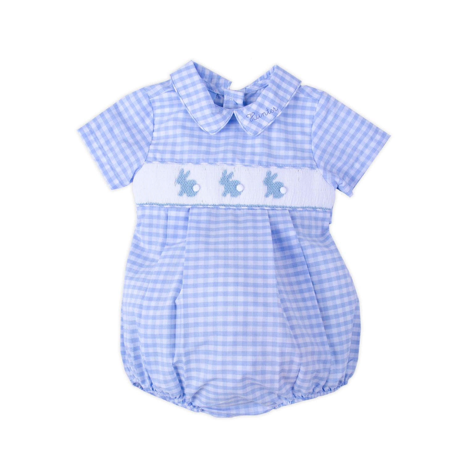 Celebrate Easter in our Light Blue Check Bunny Smocked Collared Bubble! This charming light blue check bubble features adorable smocked bunnies, an elegant collar, and short sleeves, adding a festive touch. Designed with snaps in stride, it’s the perfect outfit for Easter celebrations and family gatherings!