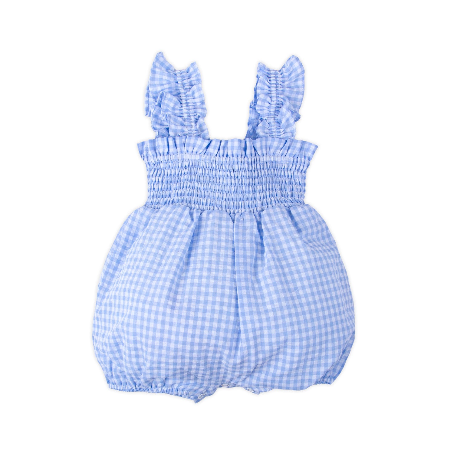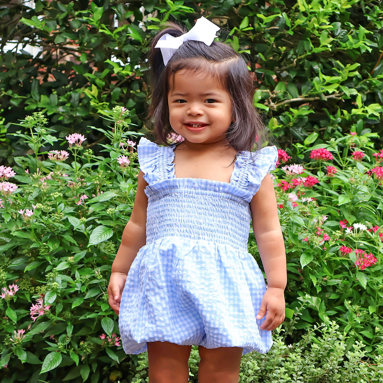 Celebrate spring and summer with our Light Blue Gingham Smocked Hannah Bubble! Featuring classic light blue gingham, stretch smocking, and wide flutter straps, this bubble is perfect for twinning with mom. Designed with snaps in the stride for easy changes, it’s ideal for sunny days and special occasions alike!