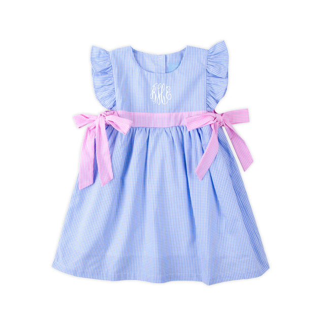 The Light Blue & Pink Gingham Avery Dress is a delightful and playful choice! Featuring light blue gingham fabric, flutter sleeves, and pink gingham side ties, it's perfect for spring and summer. Add a monogram for a personalized touch and make it even sweeter!
