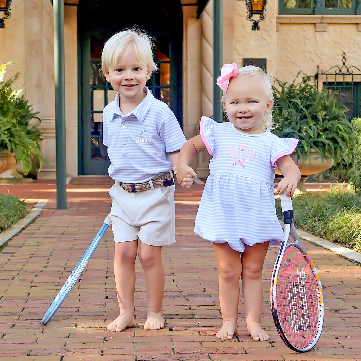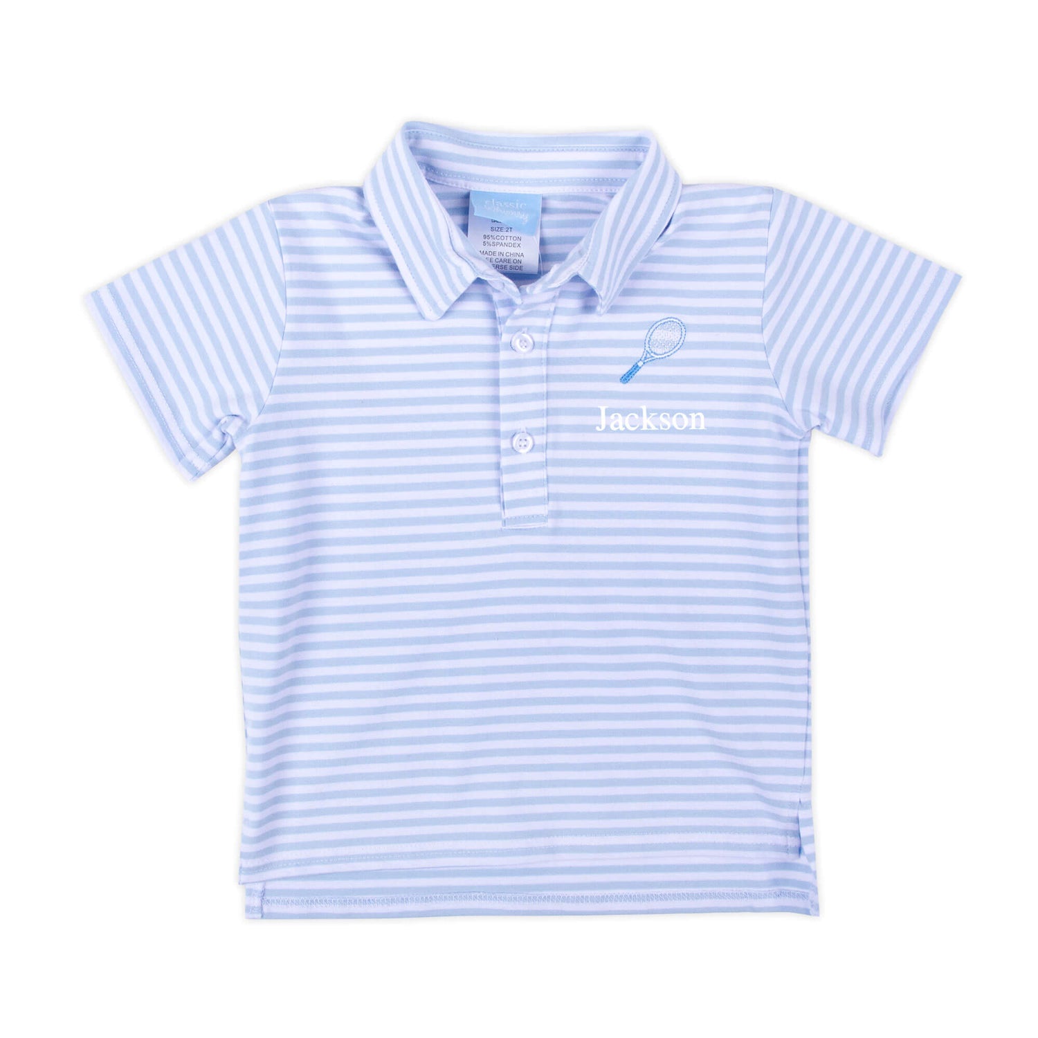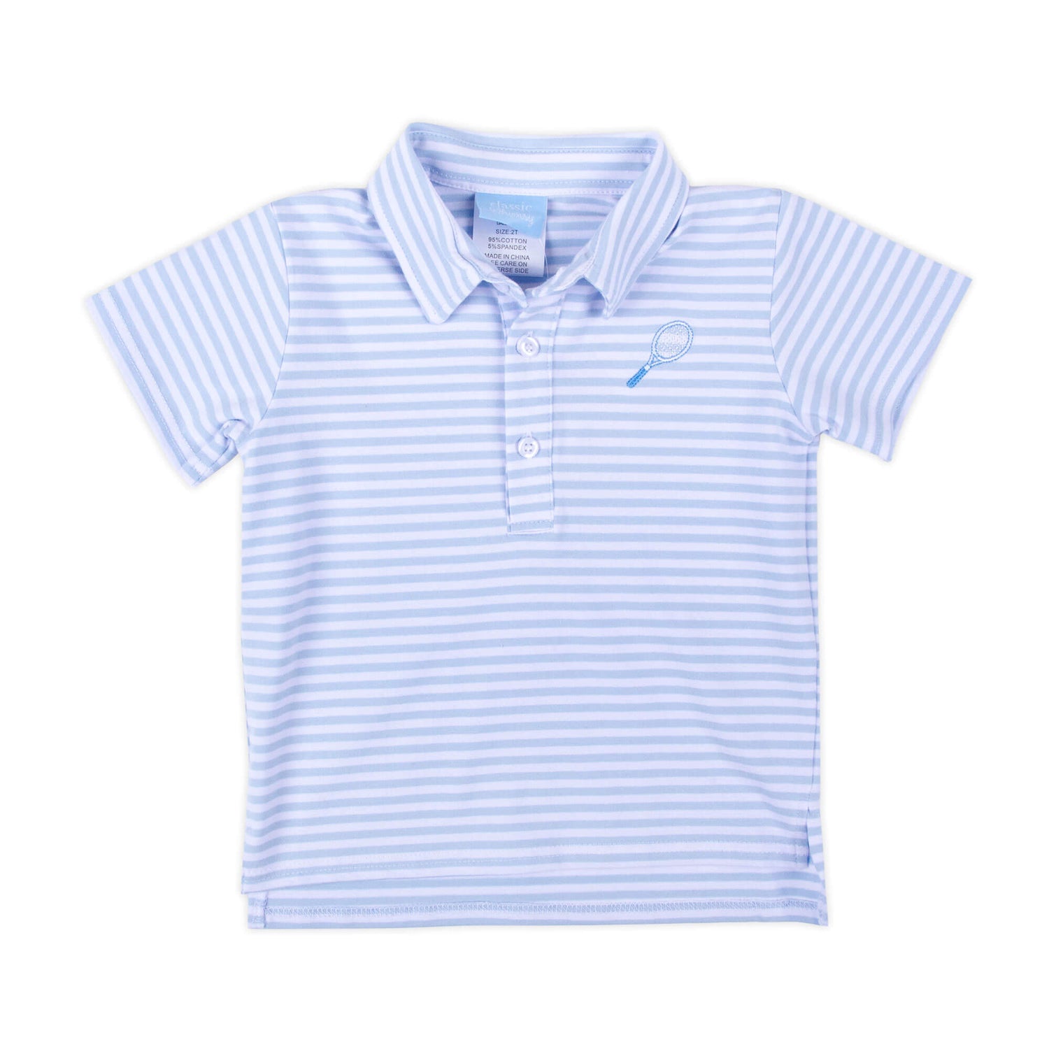 Gear up your future tennis partner in the adorable boy's short sleeve polo shirt. This French blue stripe knit polo is not just stylish but also features an embroidered tennis racquet, adding a playful and sporty flair. Make it uniquely theirs by personalizing it with a monogram, ensuring they step onto the court in style!