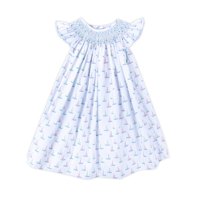 Elevate your summer style with our Nautical Blue Stripe Smocked Angel Sleeve Dress, the ideal outfit for your upcoming vacation. This blue stripe sailboat print dress is adorned with exquisite geometric smocking. The dress features angel sleeves with light blue picot trim, adding a touch of nautical charm to your little one's summer wardrobe.