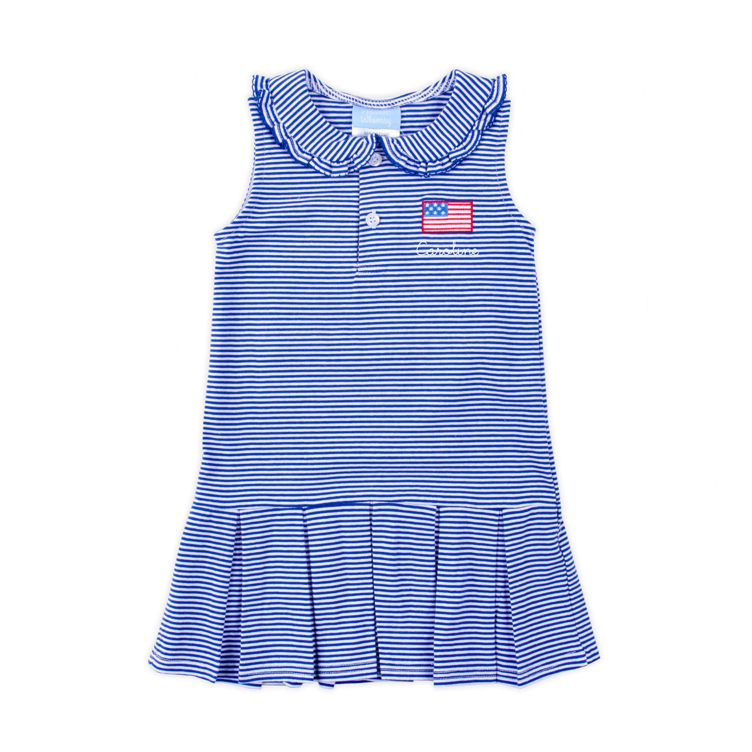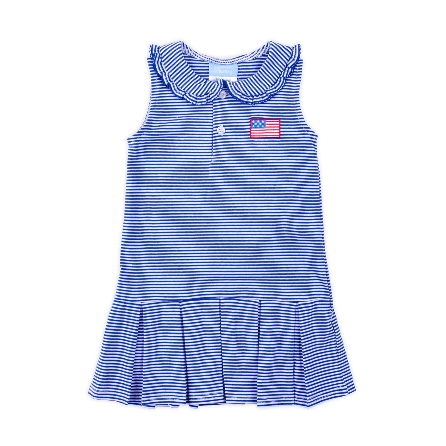 The Patriotic Spirit Blue Stripe Ruth Dress is a comfortable and stylish outfit for your little one. This Ruth-style dress, designed from blue stripe knit, features a ruffled collar and an embroidered flag. Add a monogram to personalize this summer outfit.