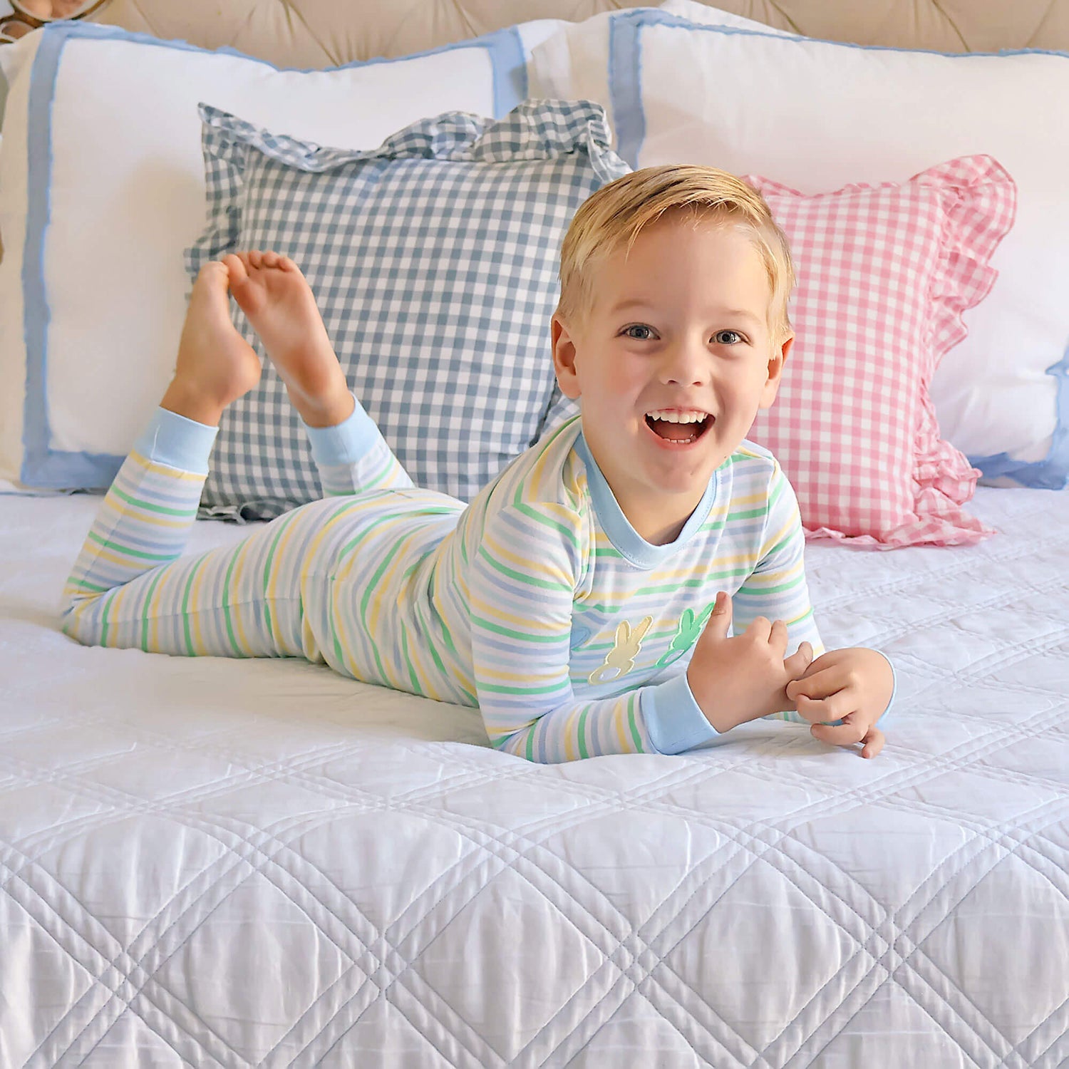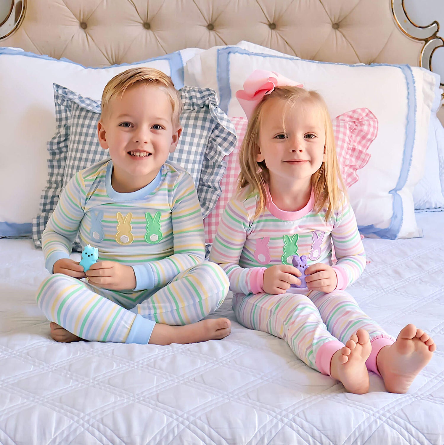 These Peeps Pastel Blue Stripe Pajamas will have your little one ready for Easter morning! The multi-color striped long-sleeve pajama top features sweet bunny peep appliqués and pairs perfectly with matching striped pajama bottoms with light blue trim. Add a monogram for a special, personalized touch that makes this look even more delightful for the Spring season.
