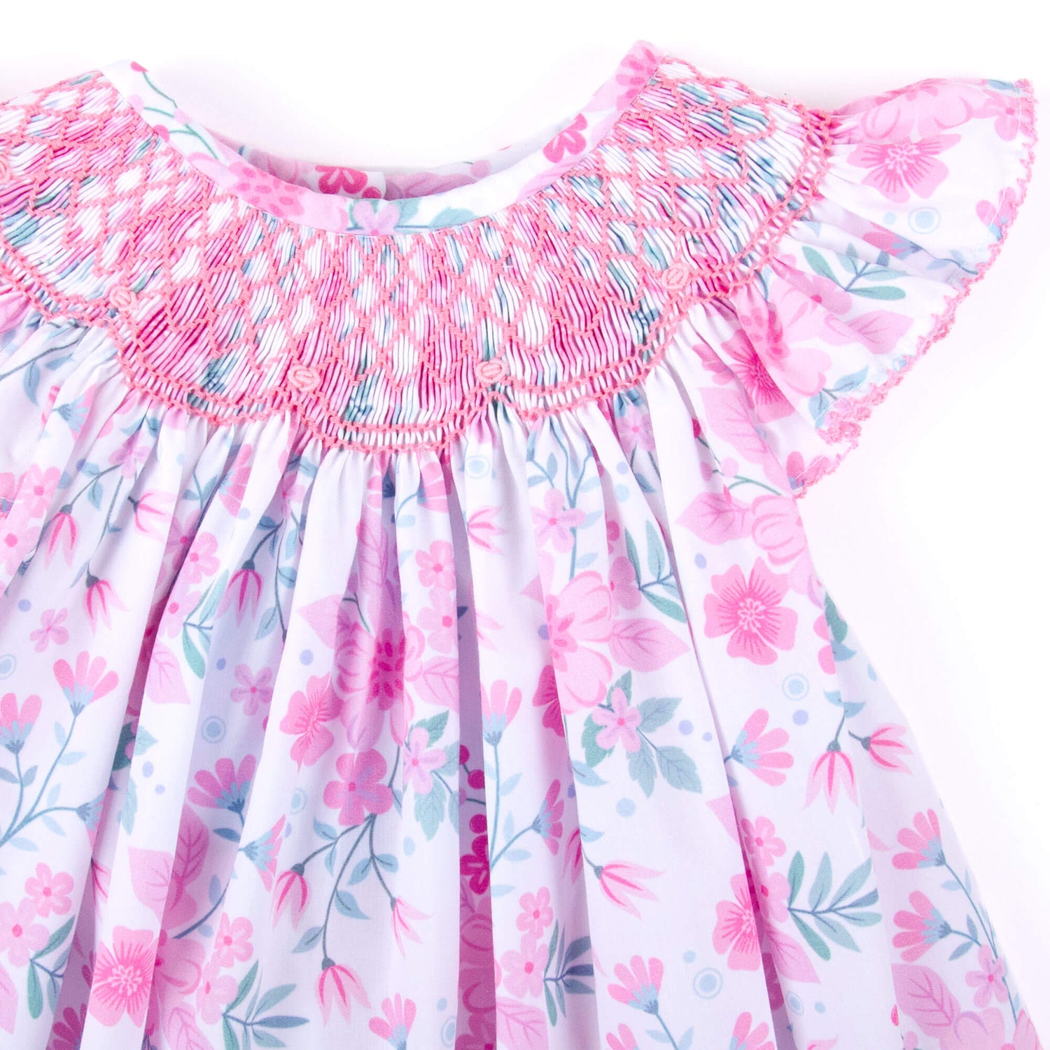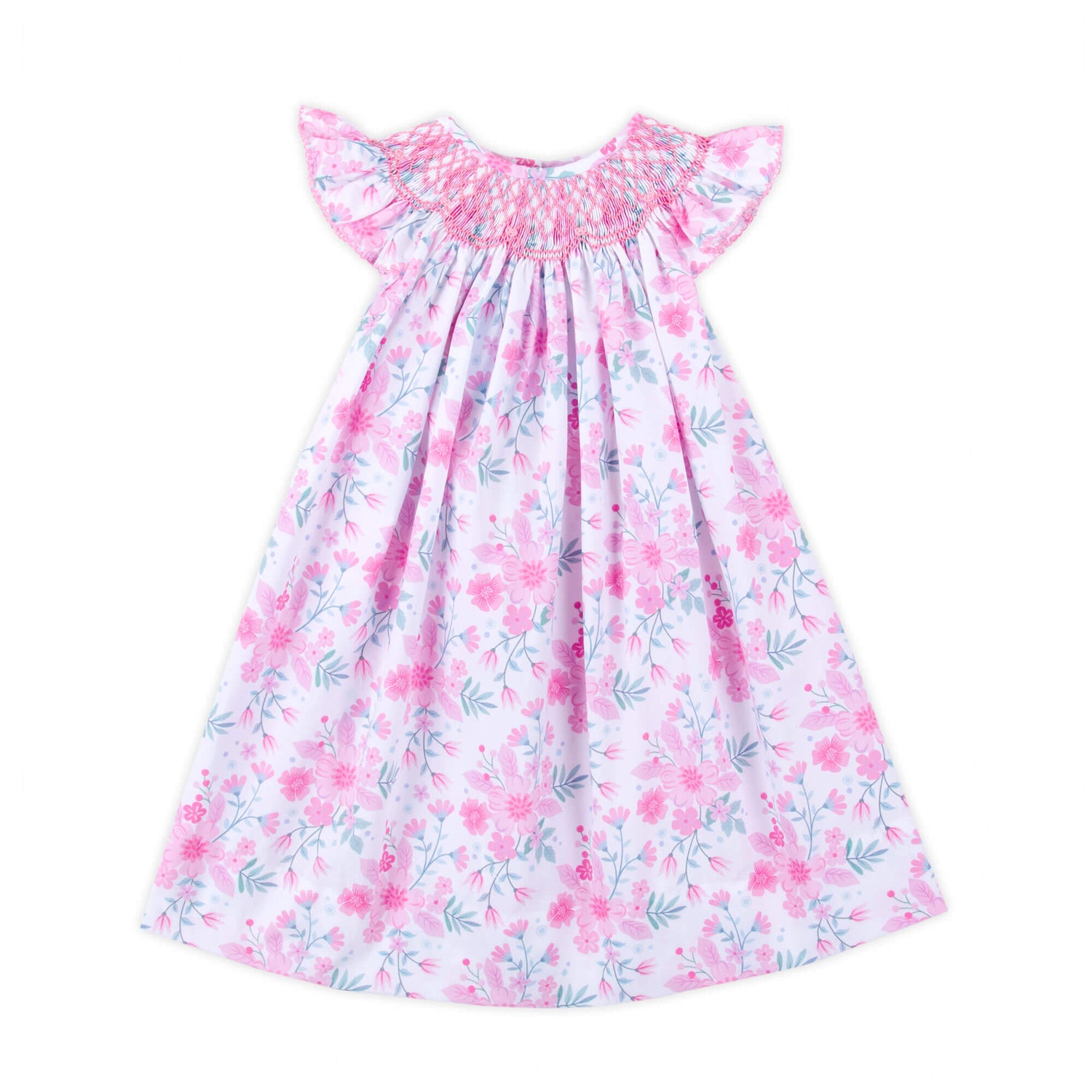 Spring is blooming, and so is our Petal Dream Pink Smocked Angel Sleeve Dress! This pink floral dress features geometric smocking and angel-style sleeves with pink ric-rac trim.