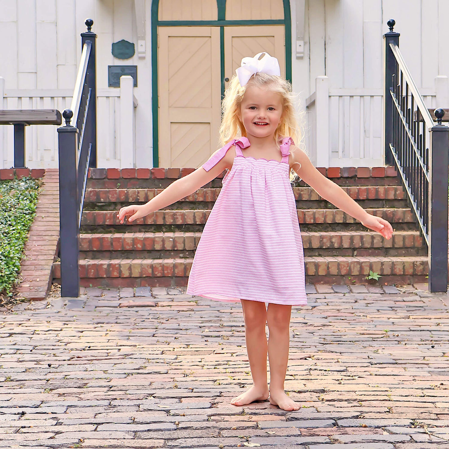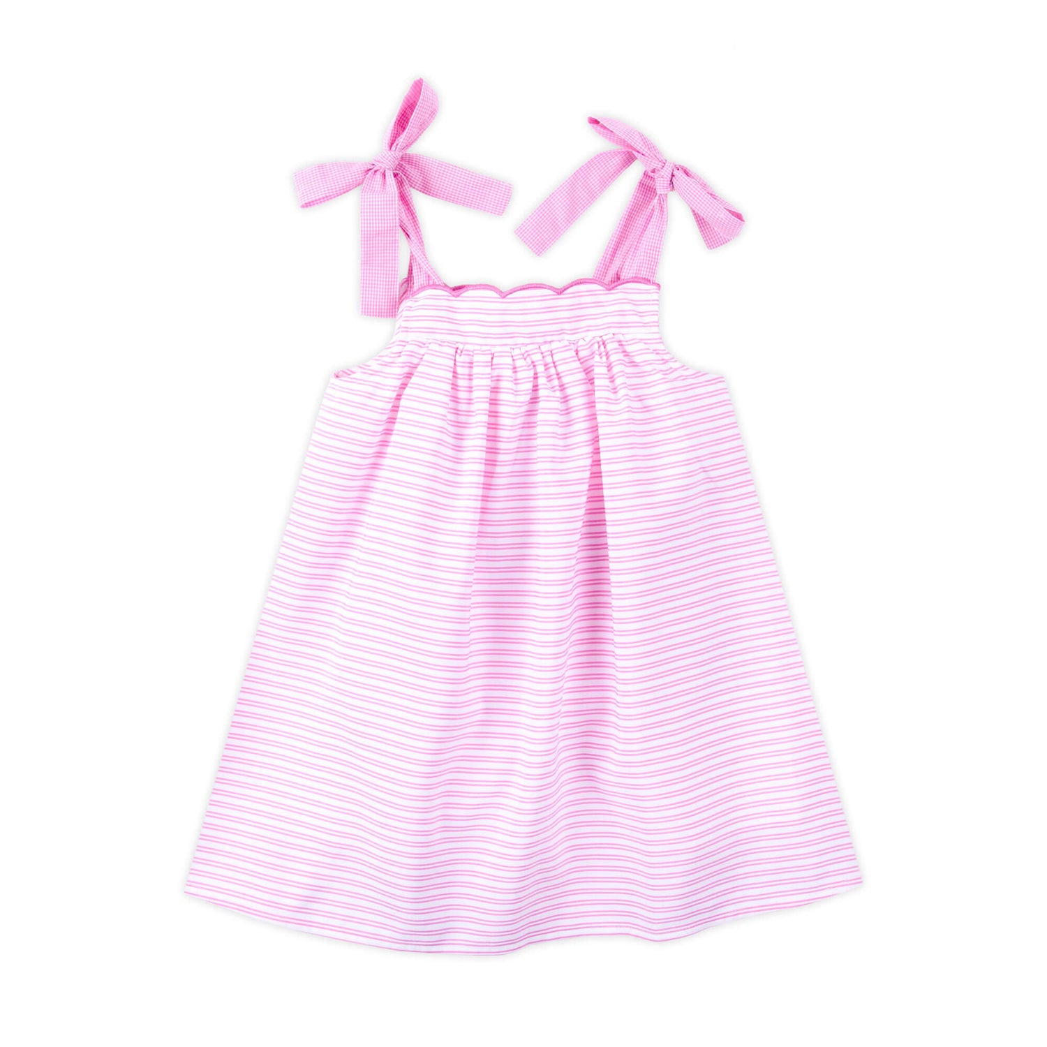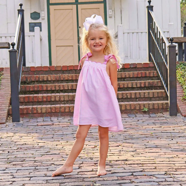 Get ready for sunny day adventures in this adorable Pink Stripe Aurora Dress! Featuring pink and white vertical stripes, tie straps, and a scalloped hem, this dress is perfect for fun-filled days.