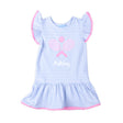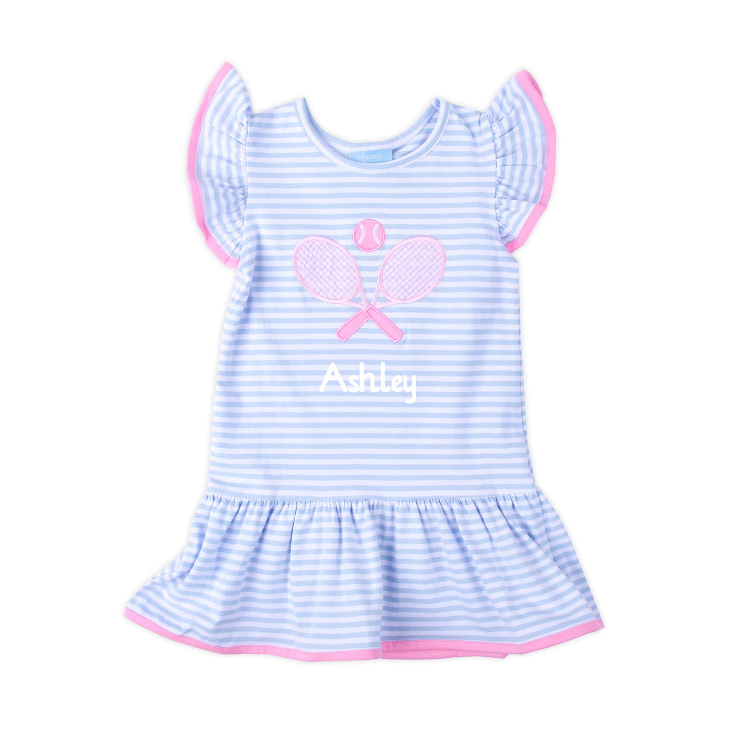 Prepare your little one for tennis fun with the Pink Tennis Racquet Light Blue Stripe Lainey Dress! This light blue striped knit dress features flutter sleeves, a drop waist detail, and a charming tennis racquet appliqué. Add a monogram to complete the look!