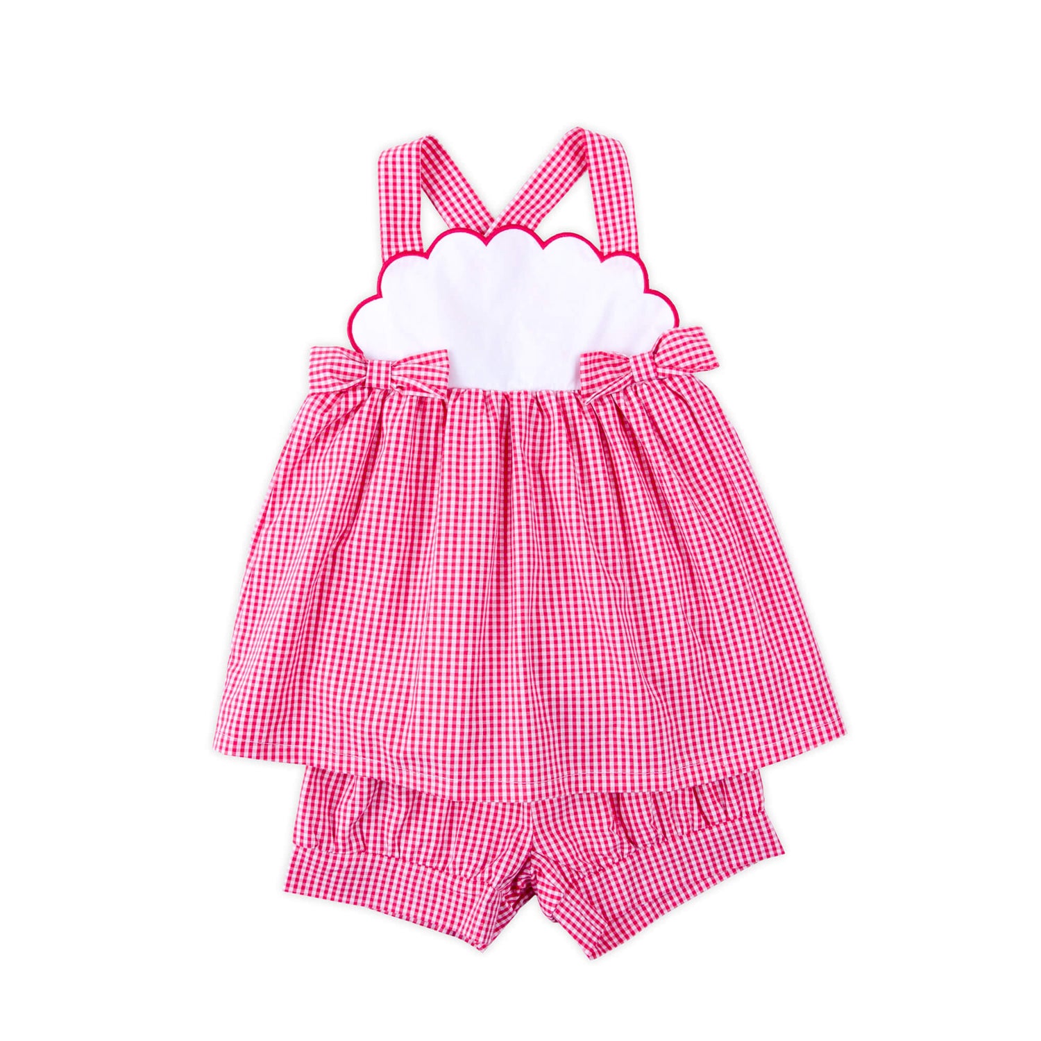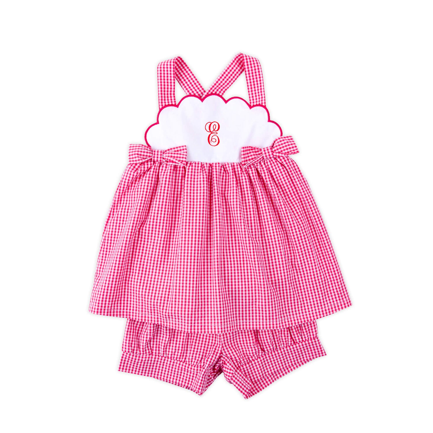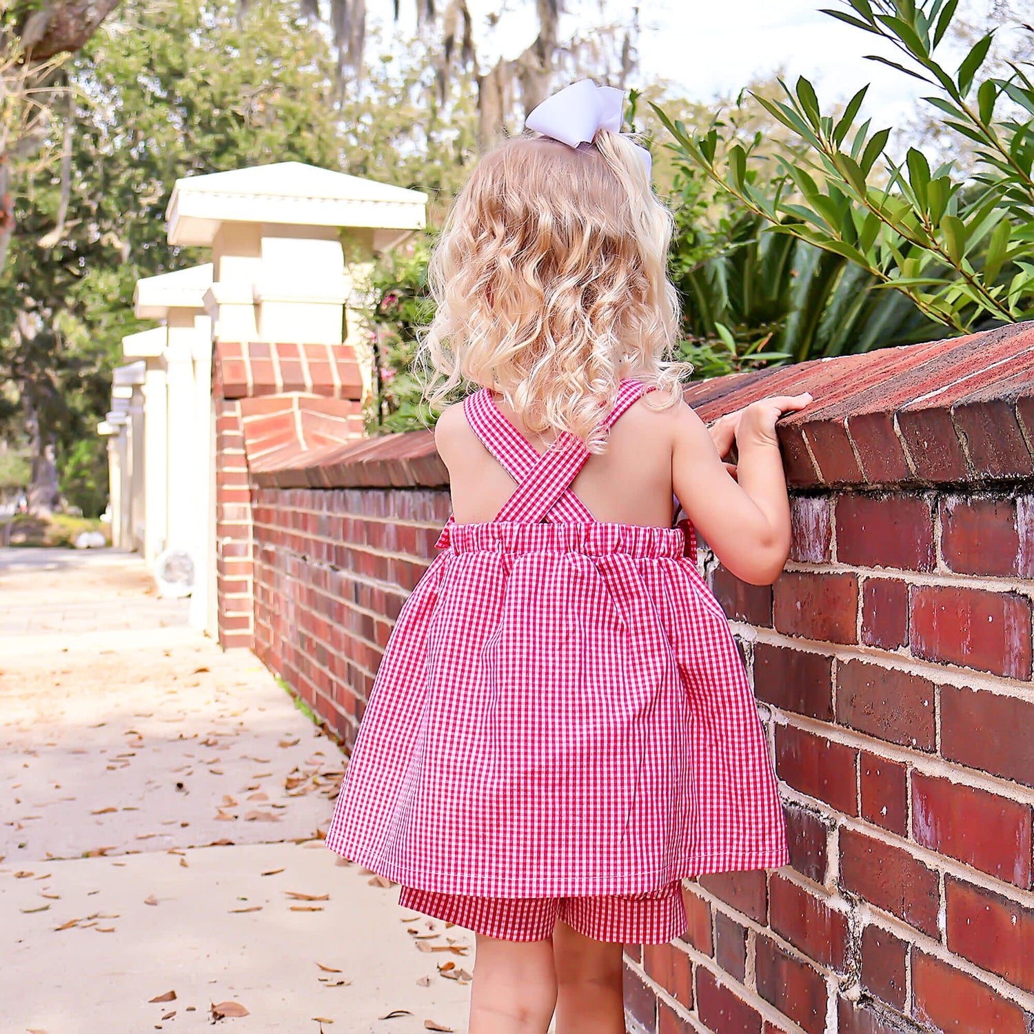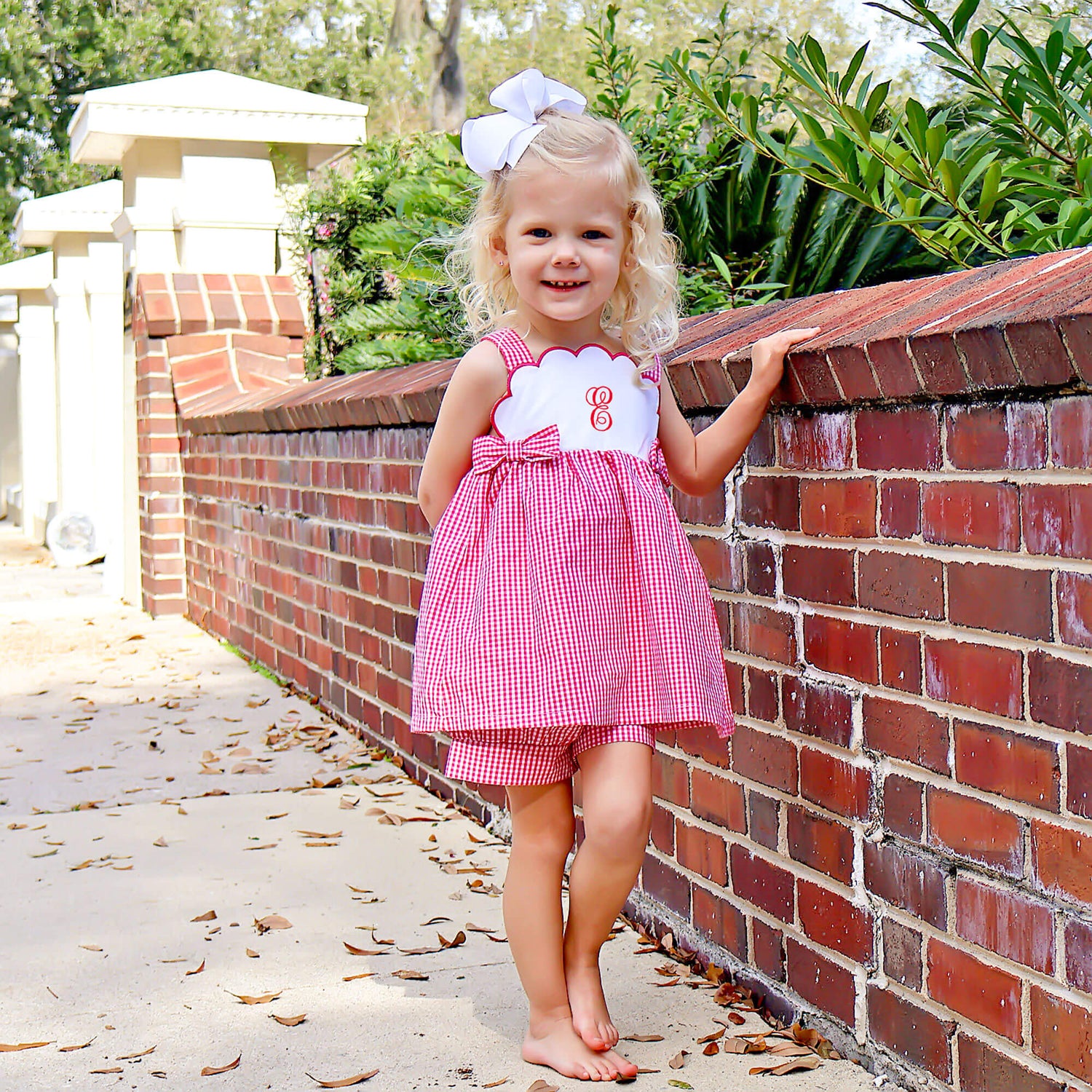 This raspberry Red Gingham Tess Short Set is a stylish and comfortable choice for any sunny day. The top features a charming red gingham print, a scalloped bodice, and sweet side tie bows. Perfectly paired with matching red gingham shorts. Add a monogram for a personalized touch!