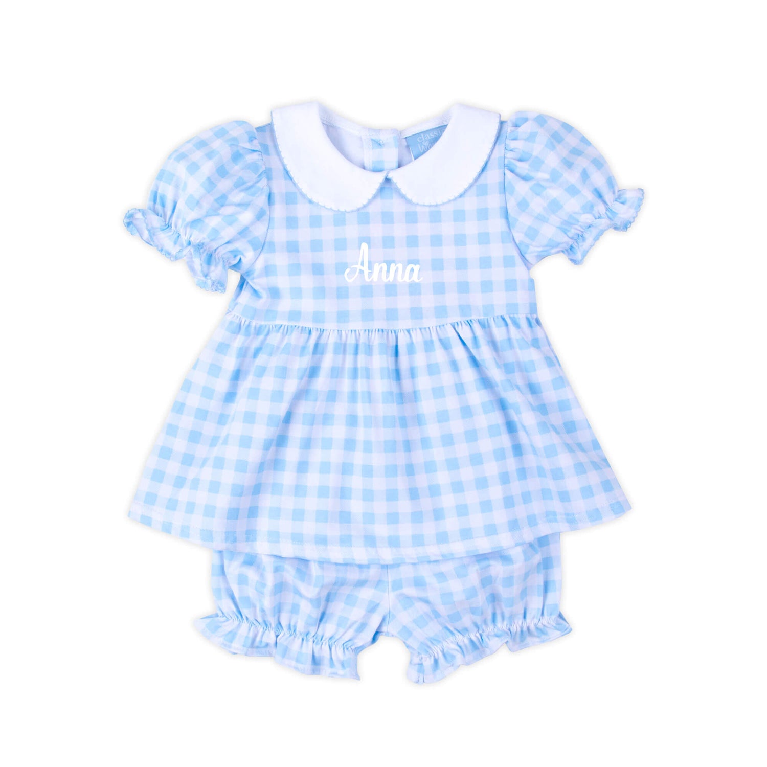 Your little girl will adore wearing the Riley Gingham Knit Bishop Sleeve Bloomer Set all spring and summer! The Riley-style top, designed in a knit gingham print, features a charming white collar and bishop sleeves with blue picot trim. Paired with matching blue gingham bloomers, this set is as sweet as can be. Add a monogram for an extra-special touch. It's the perfect outfit for any sweet adventure!