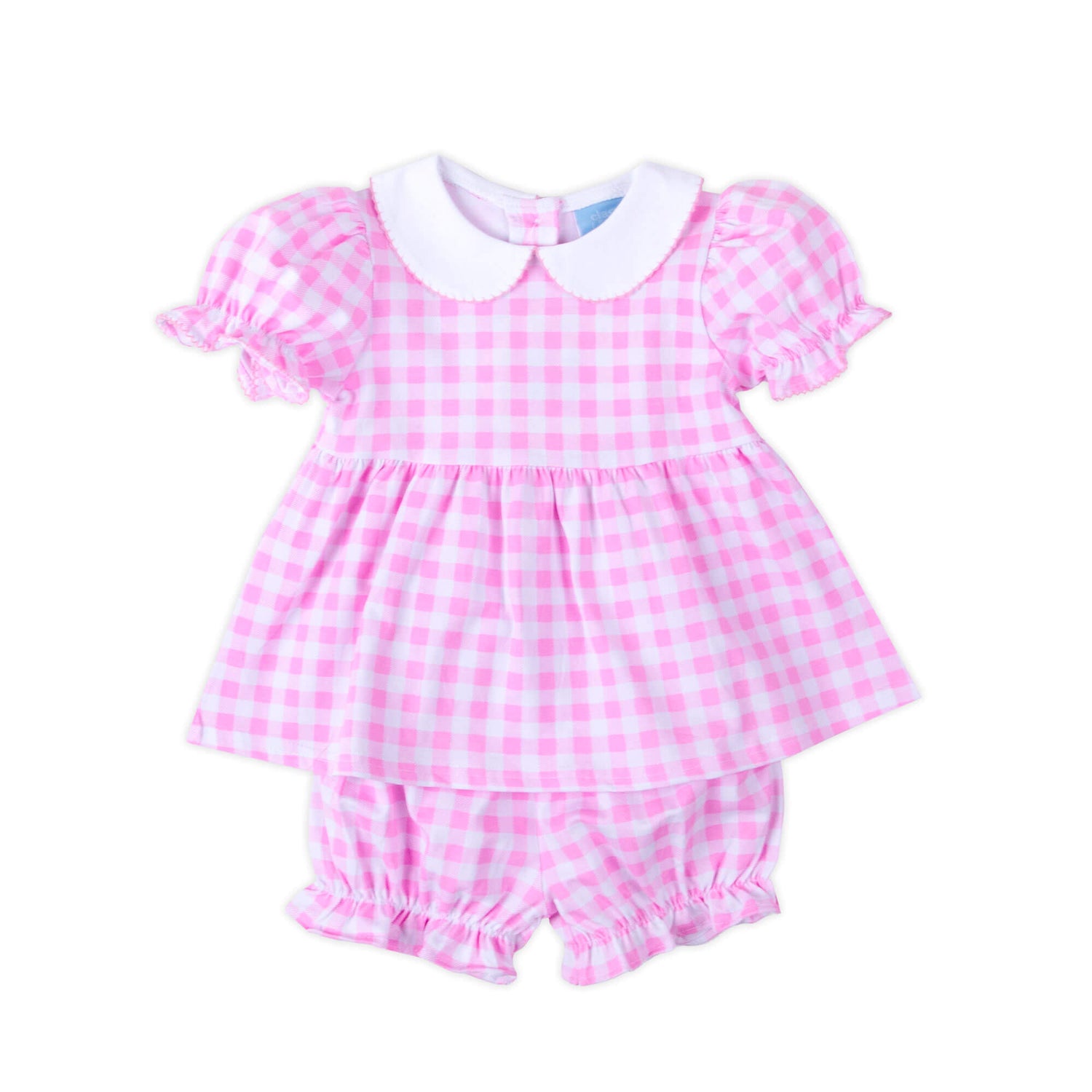 Your little girl will adore wearing the Riley Gingham Knit Bishop Sleeve Bloomer Set all spring and summer! The Riley-style top, designed in a knit gingham print, features a charming white collar and bishop sleeves with pink picot trim. Paired with matching pink gingham bloomers, this set is as sweet as can be. Add a monogram for an extra-special touch. It's the perfect outfit for any sweet adventure!