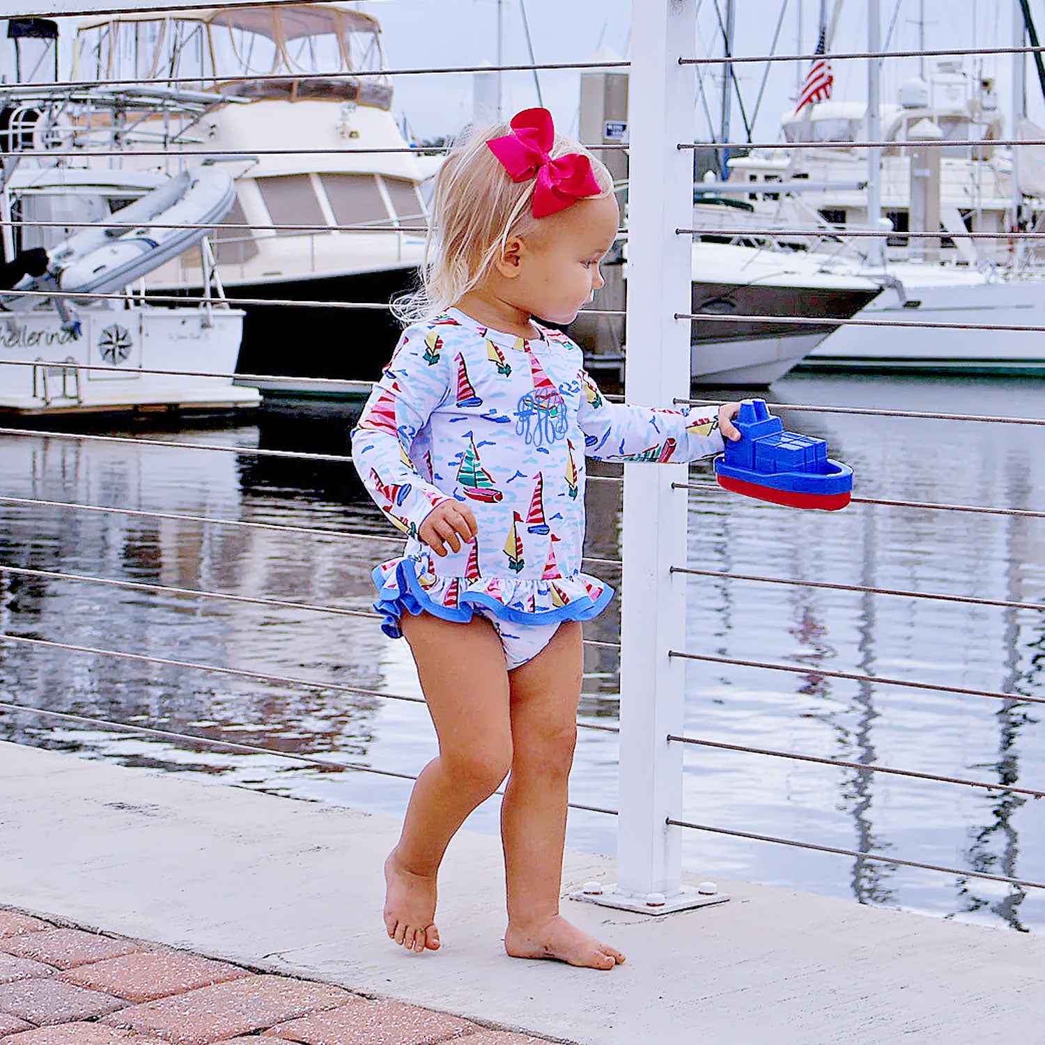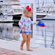 This Watercolor Sailboat Rash Guard Set is the ideal swimsuit for your upcoming family vacation or poolside gathering. The long-sleeve swim top features a charming sailboat print and a ruffle bottom hem with solid blue binding. Complete with matching swim bottoms, this set provides UPF 50 Protection to keep your little one safe under the sun.
