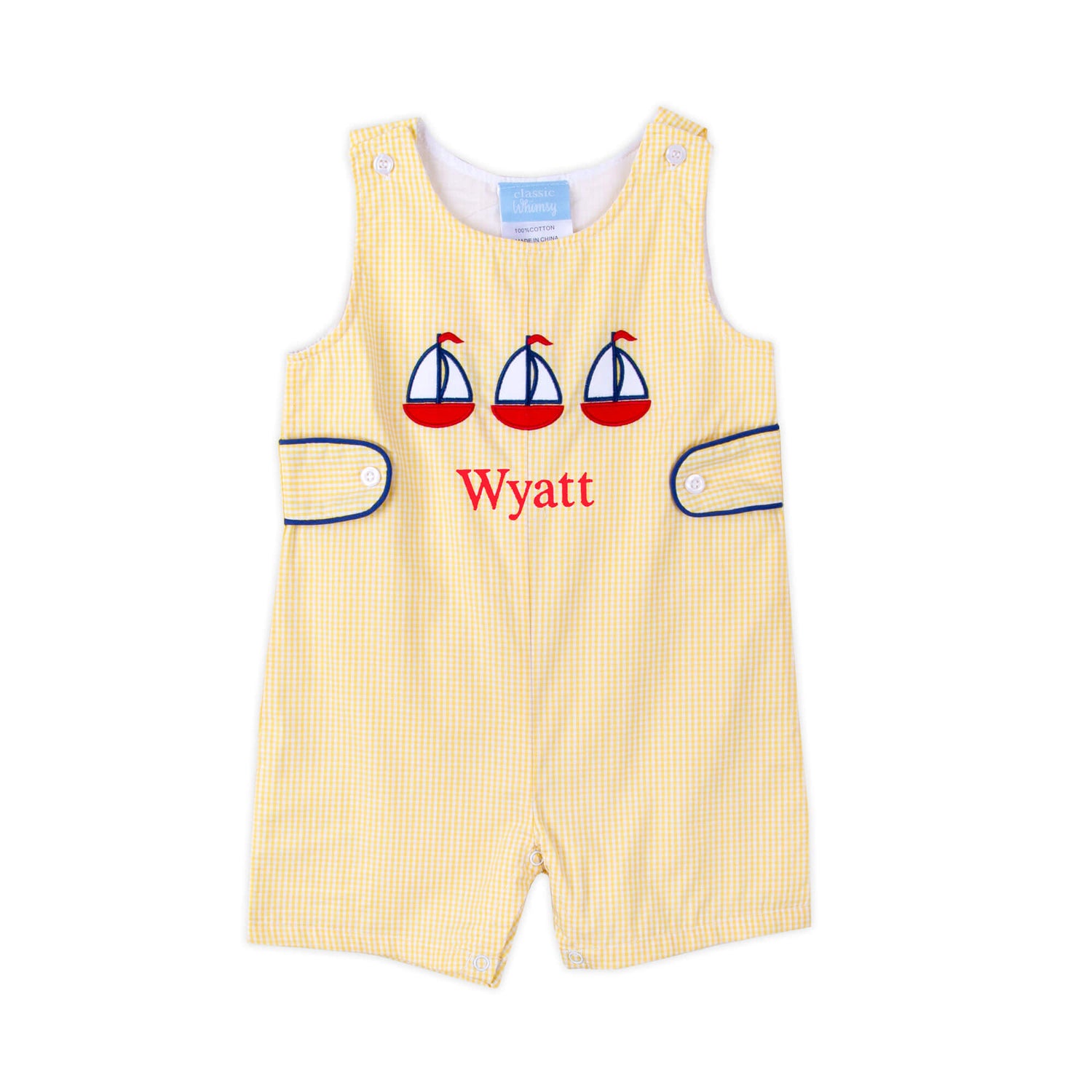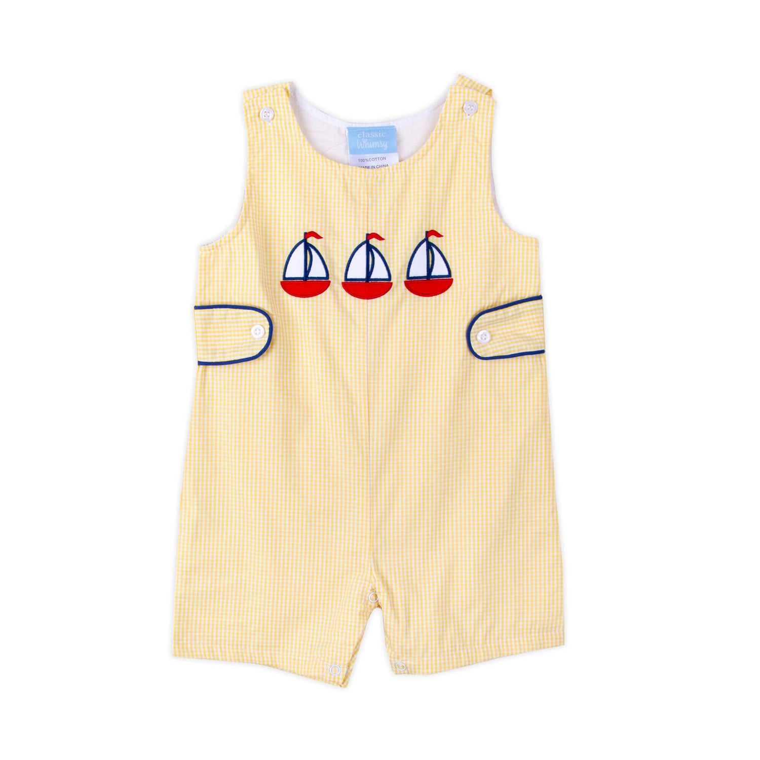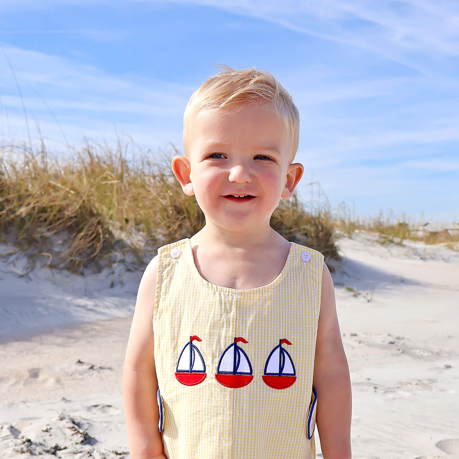 Your little one will be ready to sail into summer style in the Newport Sailboat Yellow Gingham Jon Jon! This cheerful yellow gingham Jon Jon features three sailboat appliqués. Designed with shoulder buttons and snaps in the stride for easy changes, it's perfect for sunny days and seaside adventures! Add a monogram to personalize the outfit.