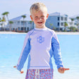 Prepare for delightful water adventures in our Santorini Blue Rash Guard. The white swim shirt with bright blue insets offers UPF 50 sun protection, ensuring a safe and enjoyable time under the sun. Perfectly coordinates with our Santorini Blue swimwear collection. Make the look uniquely yours by adding a monogram for that personal touch!