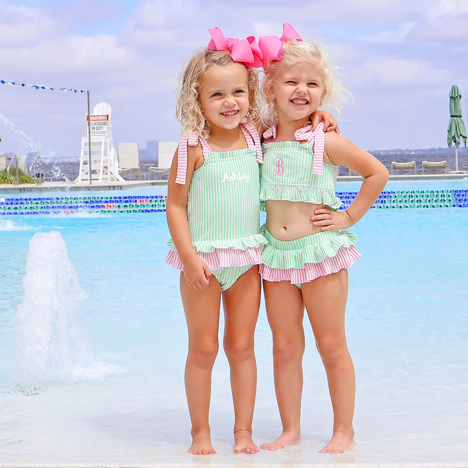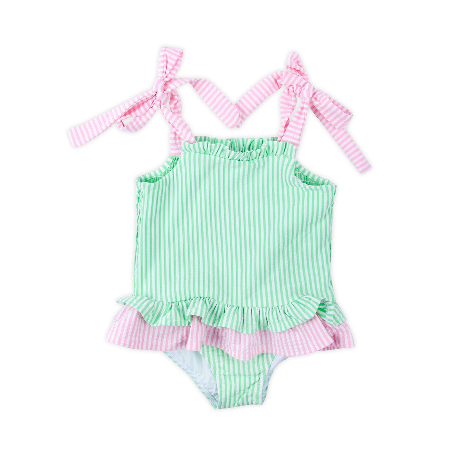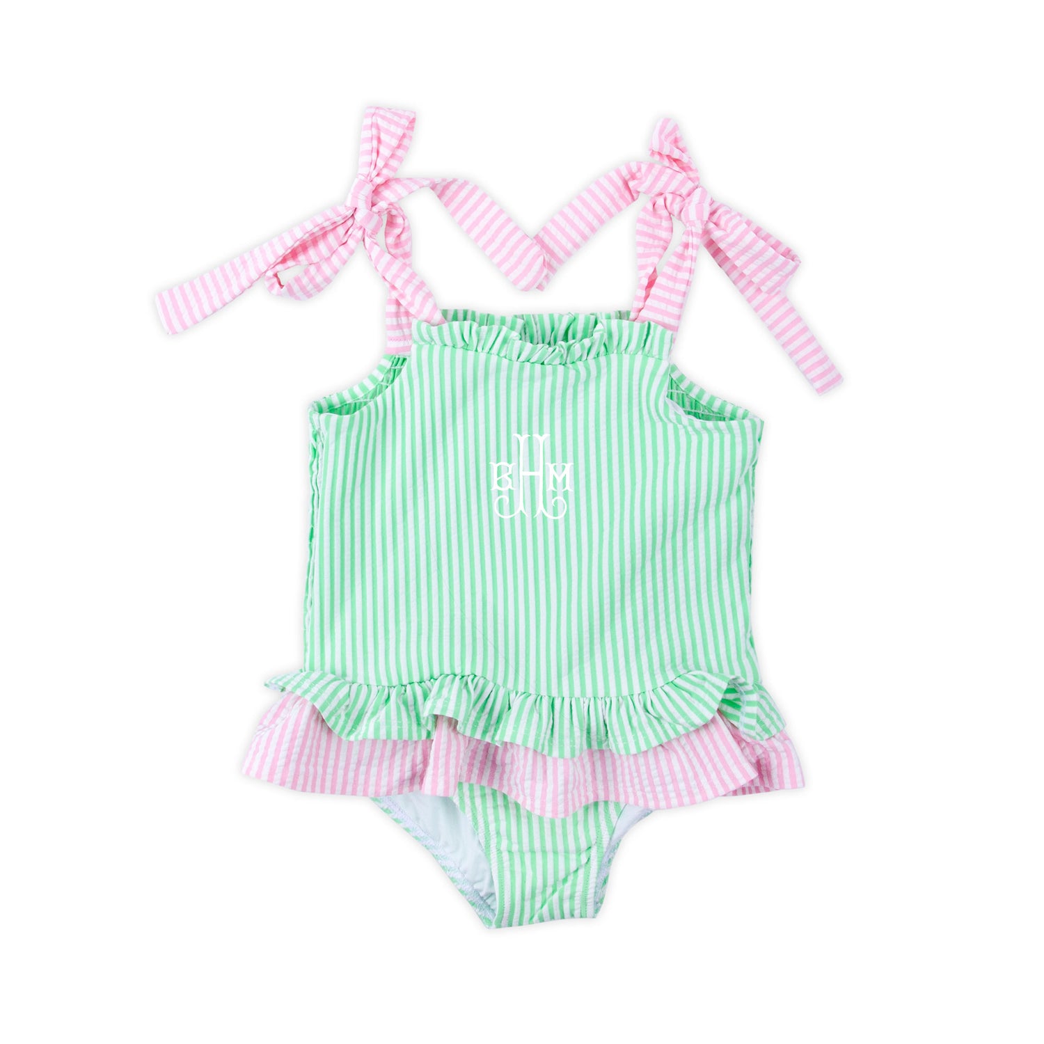 Prepare for your upcoming water adventure with this Santorini Green and Pink Stripe one Piece Swimsuit. Offering UPF 50 sun protection, the seersucker stripe one piece is finished with tie straps and ruffle trim. Personalize it with a monogram for a special touch that makes it uniquely theirs.