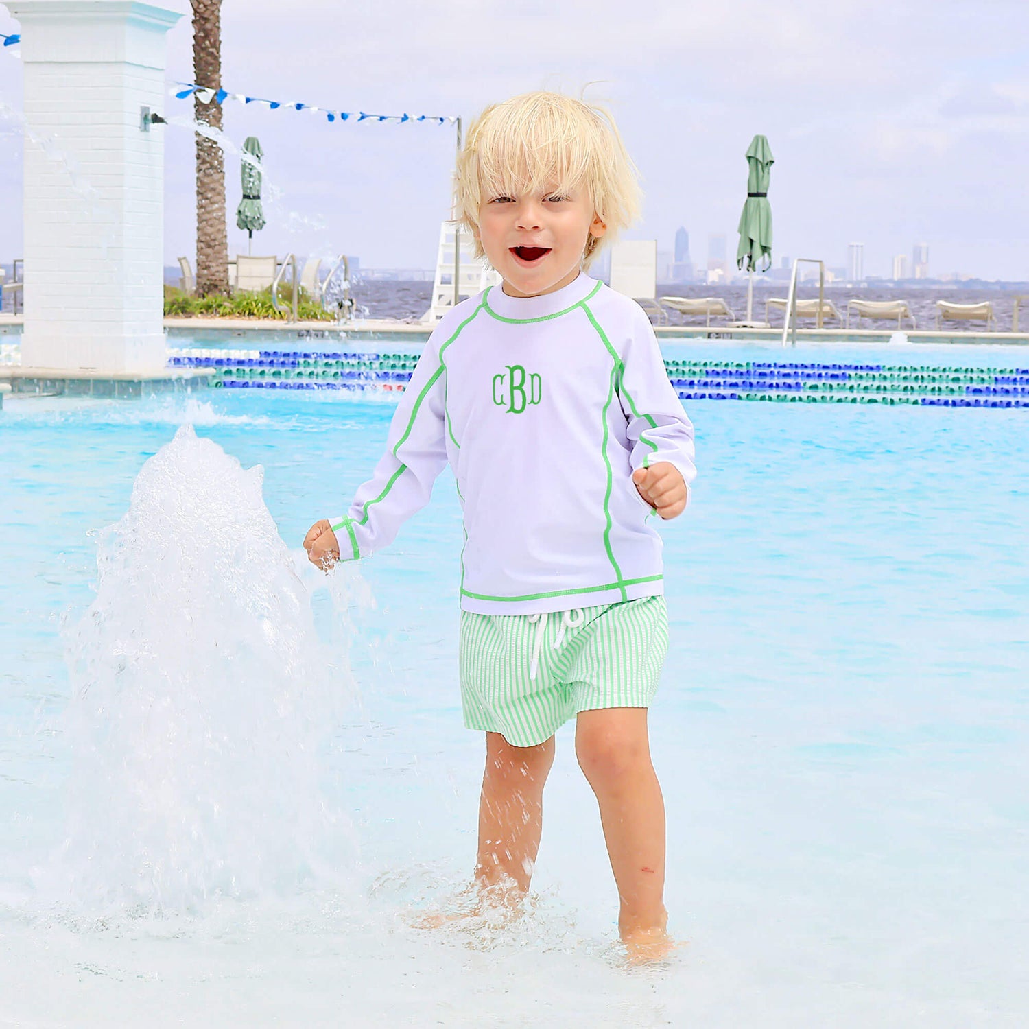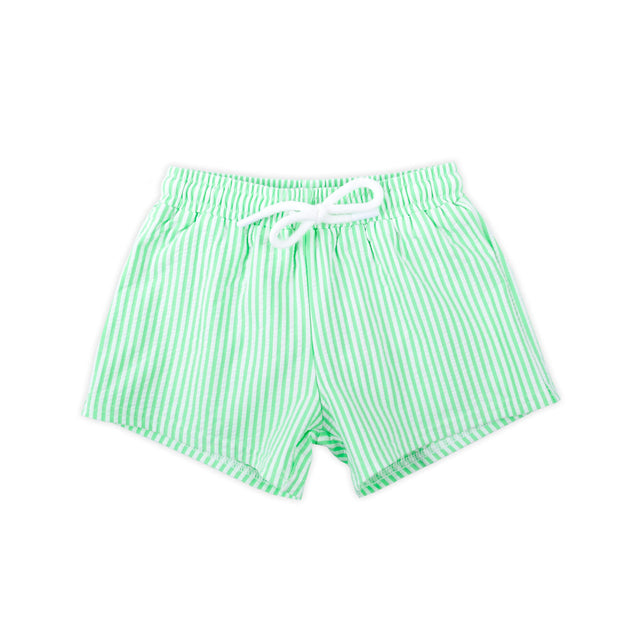 Make a statement this summer with our Santorini Green Stripe Swim Trunks! Featuring a green seersucker stripe, a mesh lining, and functional waist ties, these trunks are both stylish and practical. With UPF 50 protection, your little one will stay safe in the sun. Add a monogram to make them uniquely his!