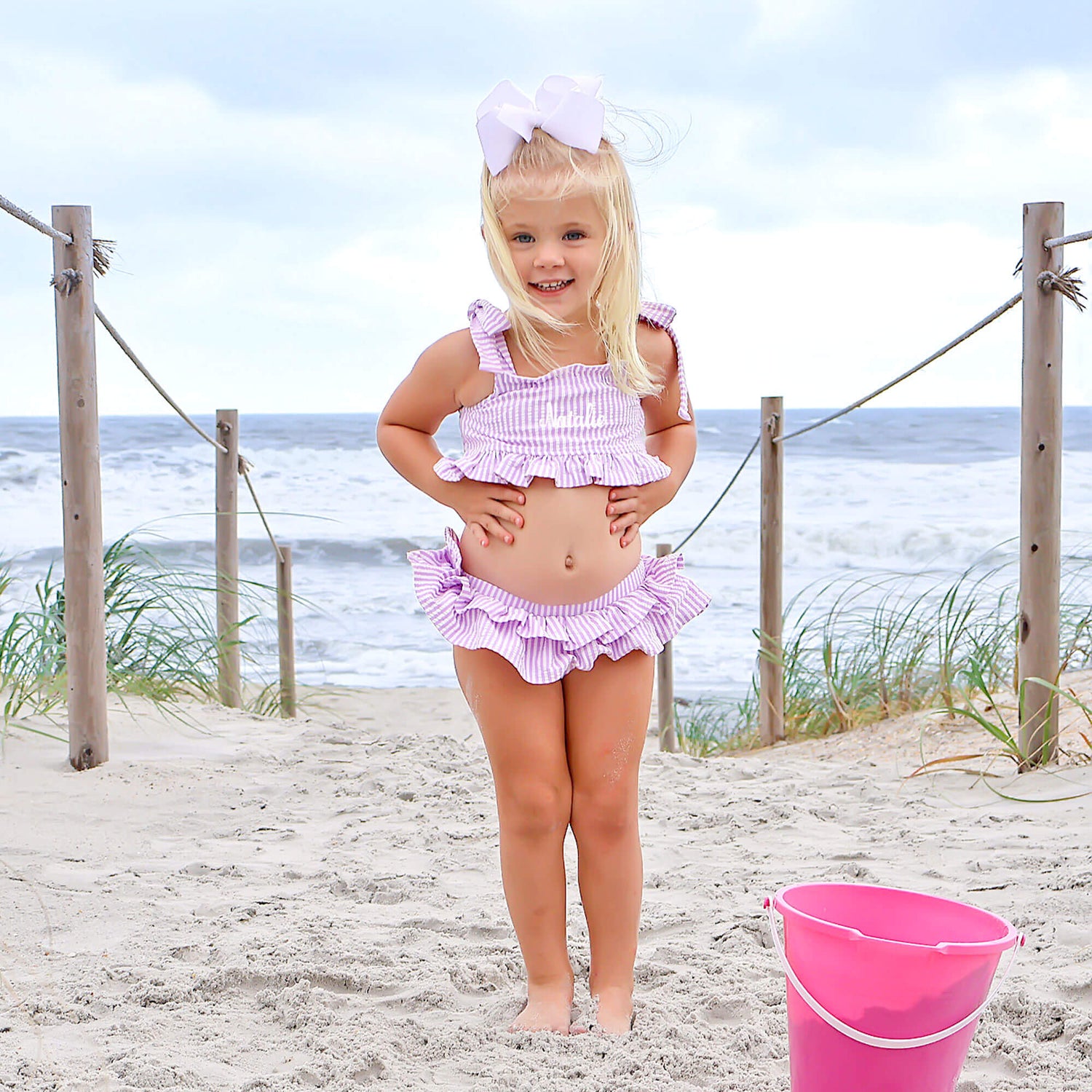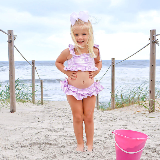 Prepare for your upcoming water adventure with this Santorini Purple Stripe Two Piece Swimsuit. Offering UPF 50 sun protection, the stretch seersucker stripe top is finished with tie straps and shirring on the back. The set is completed with matching ruffle swim bottoms for a stylish and coordinated look.  Personalize it with a monogram for a special touch that makes it uniquely theirs.