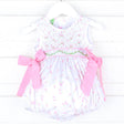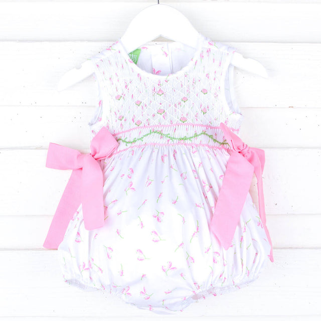 Let your little one blossom with the beauty of spring in our Spring Tulips Smocked Scarlett Bubble. This Scarlett-style bubble features a charming pink tulip print and geometric smocking with rosebud details. It also features pink side-tie bows and convenient snaps in stride.