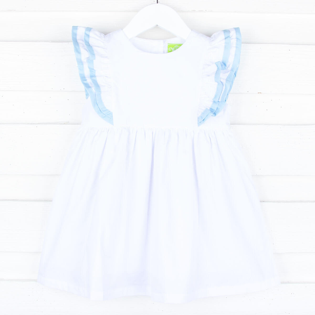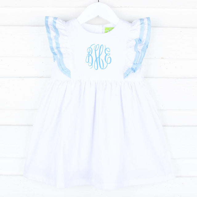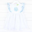 Elevate your little one's spring and summer wardrobe in our enchanting White Alice Dress with Light Blue Trim. This delightful Alice-style dress is not only perfect for any special occasion but also adds a touch of charm to everyday moments. Designed from a solid white fabric, the dress features intricately designed ruffles adorned with light blue tape trim, creating a whimsical and stylish look. To make this outfit truly unique, add a monogram for a personalized touch.
