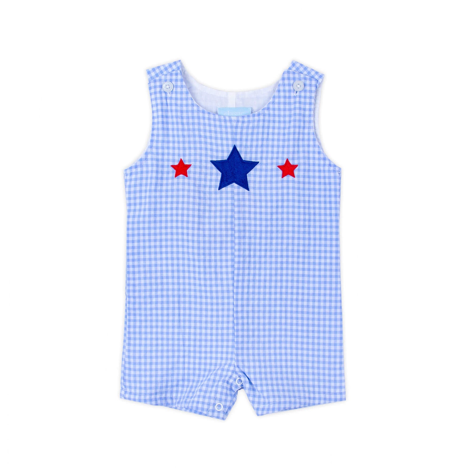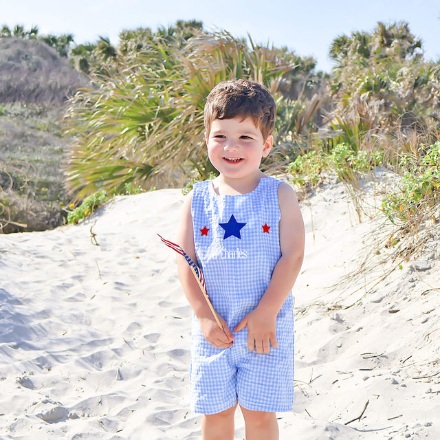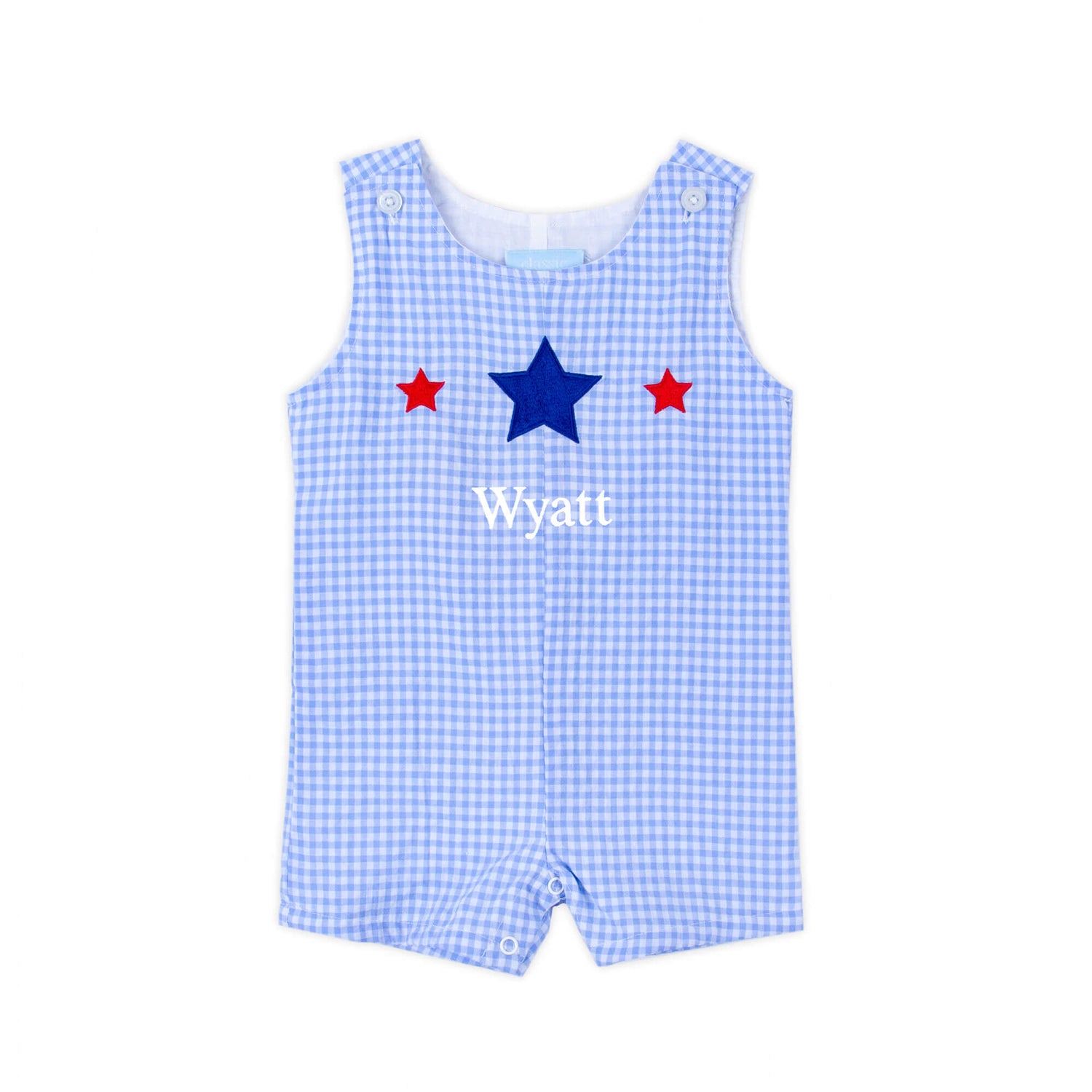 This Star Spangled Light Blue Gingham Jon Jon is perfect for celebrating the 4th of July and enjoying fireworks. It features an adorable light blue gingham with embroidered patriotic stars and snaps in stride for easy changing. Elevate its patriotic charm by adding a personalized monogram.