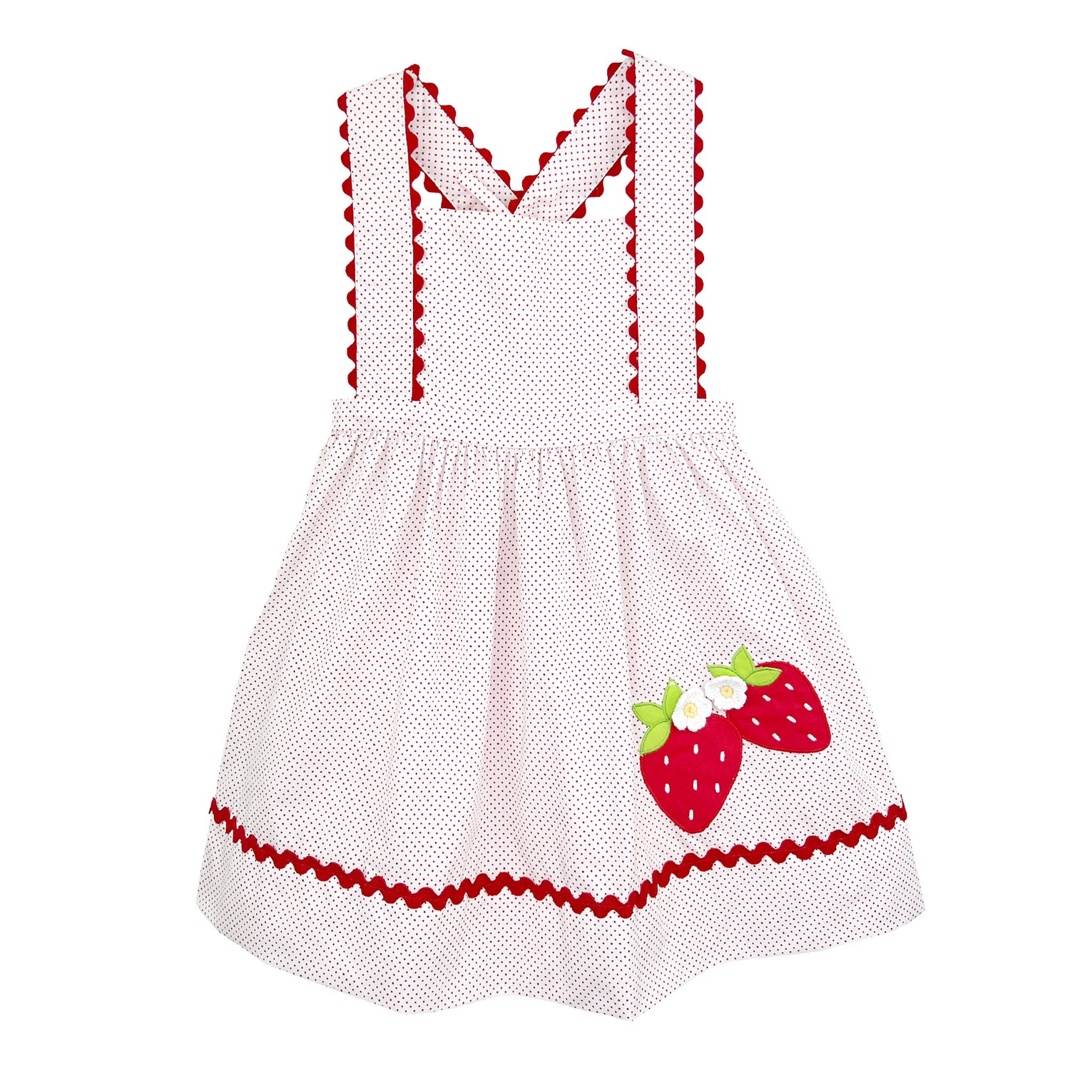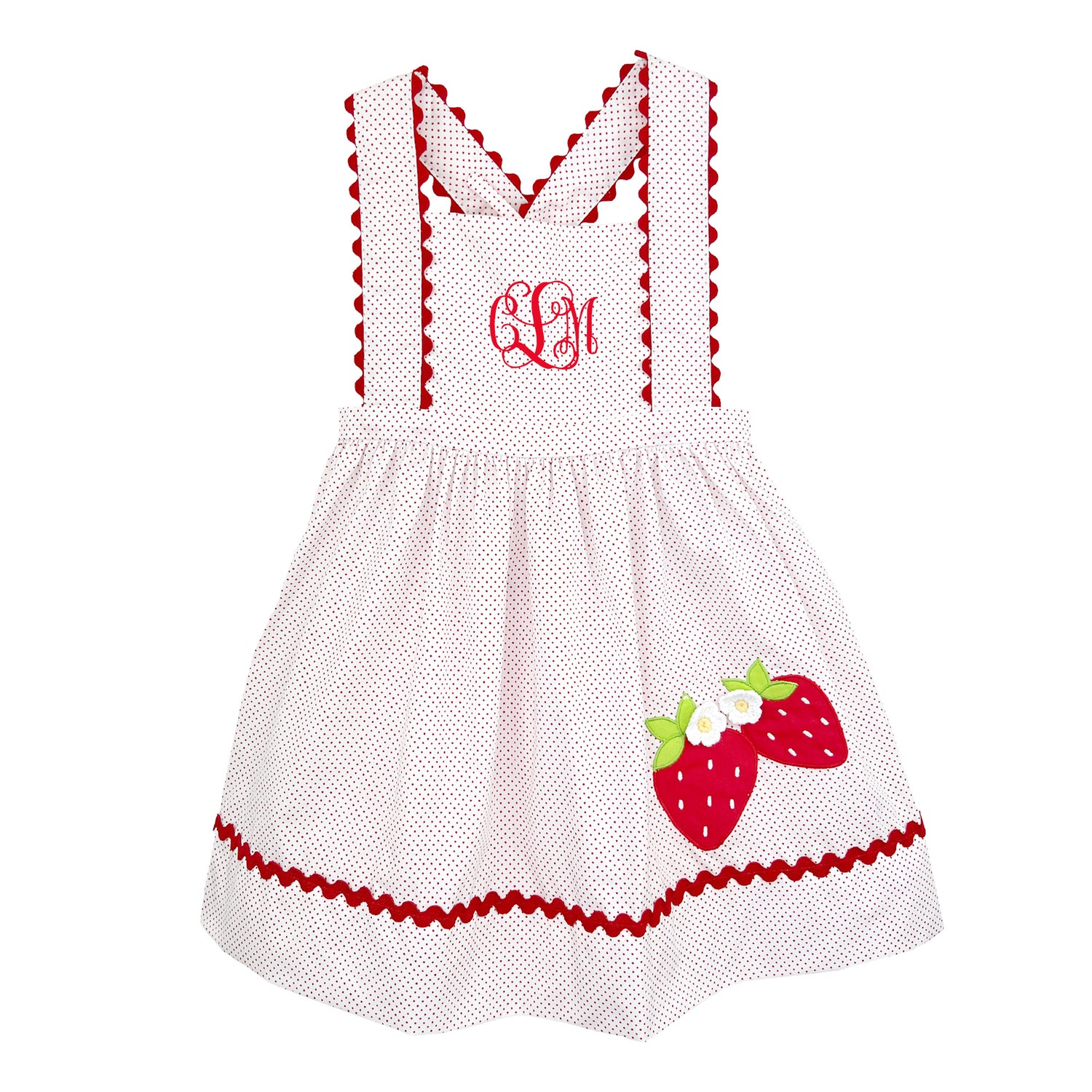 Get ready to celebrate the vibrant spirit of summer with this delightful Strawberry Red Polka Dot Sun Dress. This dress in red polka dot features wide straps with red trim and a charming strawberries applique with embroider flowers. Add a monogram for a personalized touch. Snaps in stride for easy changes.