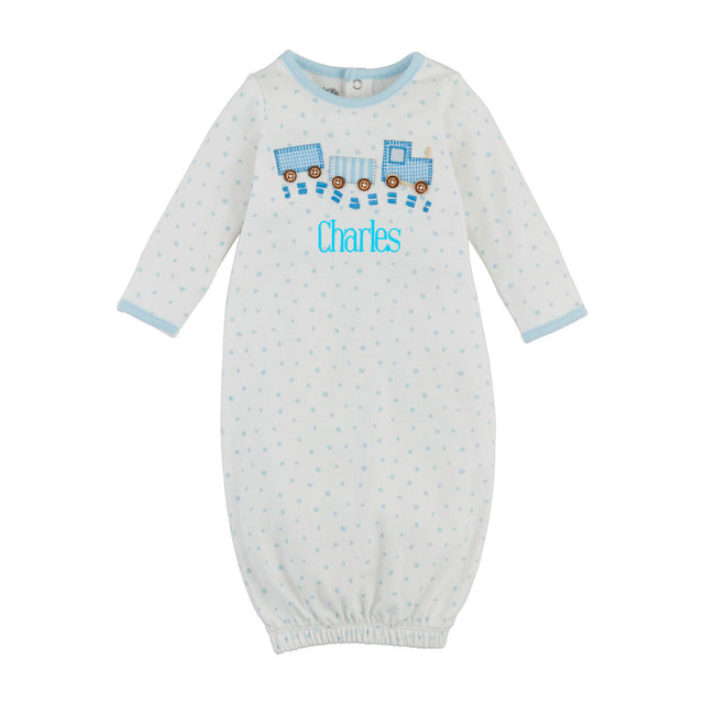 The Train Applique Sleeper Gown is a charming and cozy sleepwear option for your little one. Crafted from soft and breathable cotton interlock fabric, this gown ensures comfort throughout the night. It features an adorable train appliqué design that adds a playful touch to the garment. The contrast pointelle binding enhances the overall look with a subtle yet stylish detail. For added convenience and safety, the gown includes scratch protector mitts, keeping your baby’s delicate skin safe from accidental scratches. This sleeper gown is made from 100% cotton, ensuring a gentle and snug fit for your baby. Add a monogram to make it more special!
