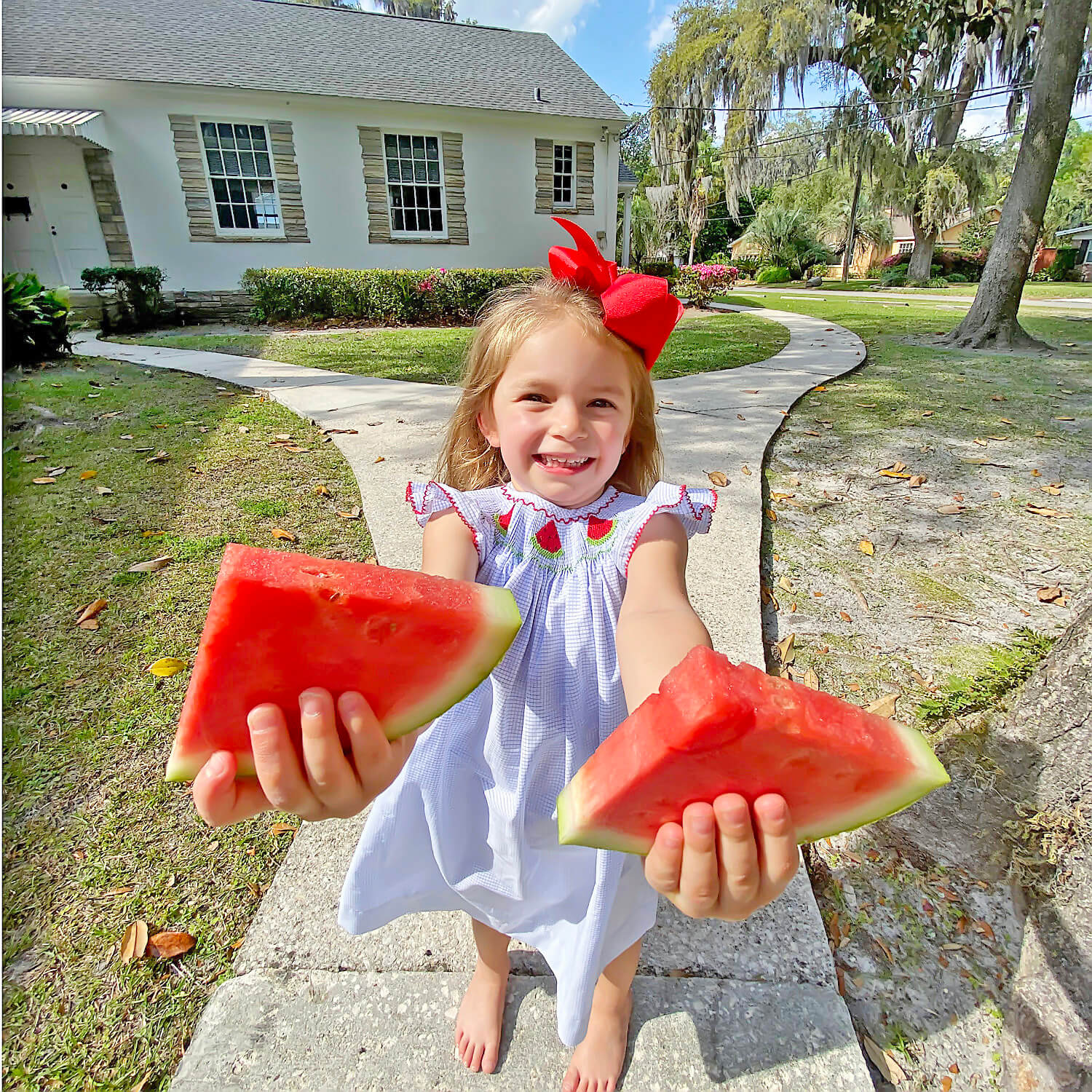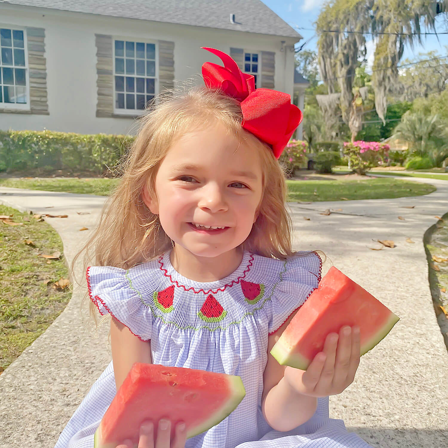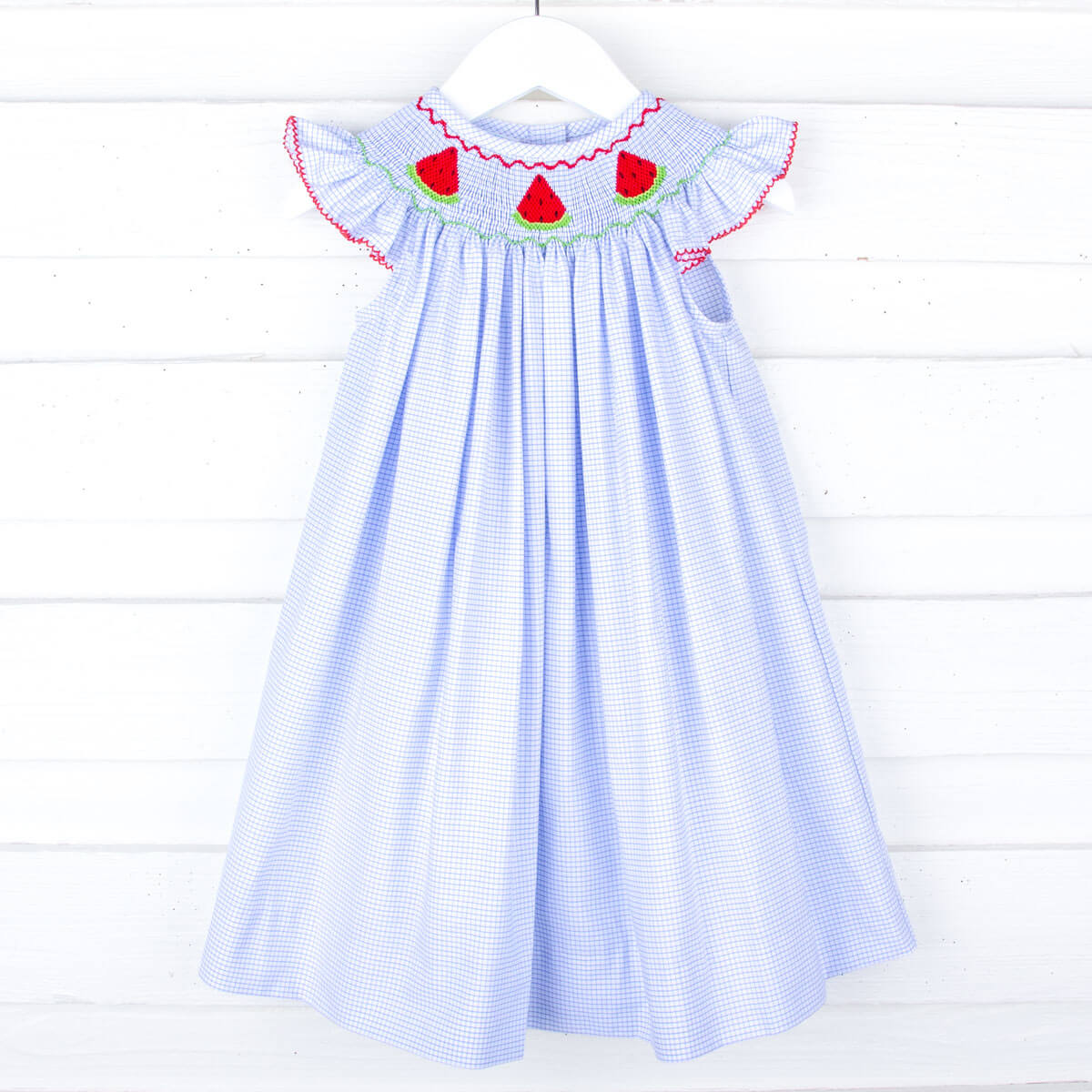 Get ready to celebrate the vibrant spirit of summer with our delightful Watermelon Blue Windowpane Smocked Angel Sleeve Dress. Immerse yourself in the playful charm of this blue windowpane dress adorned with smocked watermelons, creating a delightful and refreshing visual appeal. Enhanced by angel sleeves delicately trimmed with red picot, this dress exudes both elegance and whimsy, perfect for sunny days and joyful adventures under the sun.