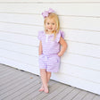 This Lavender Stripe Nina Short Set is perfect for sunny adventures or your next resort getaway! The Nina-style top, designed in lavender stripe French terry, features flutter sleeves, a ruffle collar, and henley buttons, and pairs perfectly with matching stripe shorts. Add a monogram to make it uniquely theirs.