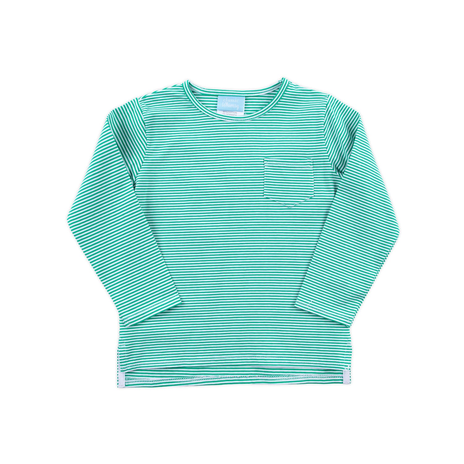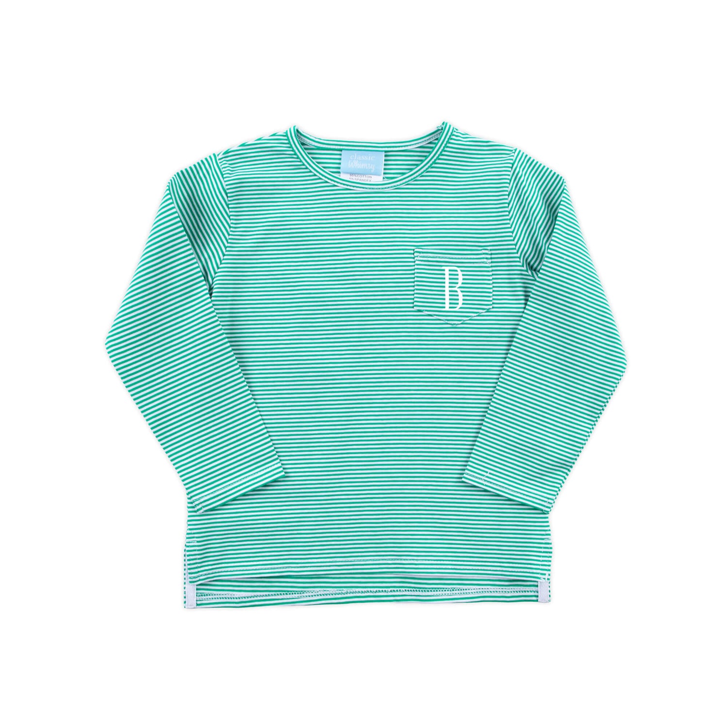 Your little one will adore our Green Stripe Long Sleeve Pocket Shirt! This knit stripe shirt features a side pocket and is perfect for everyday fun during the cooler fall and winter months. Great for mixing and matching with your favorite bottoms, it’s a comfy and cute choice for playtime and beyond. Make it extra special by adding a personalized monogram!