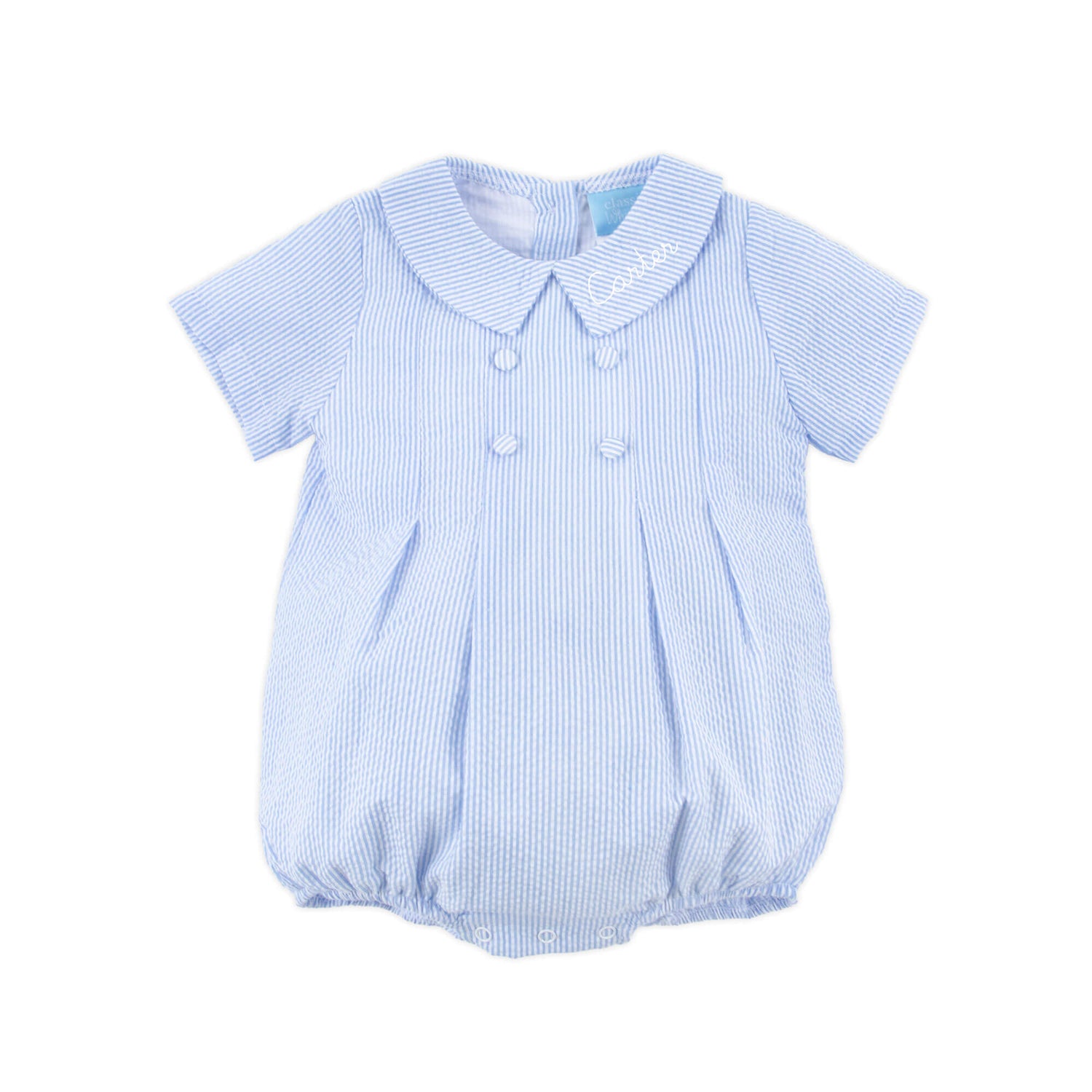 This Light Blue Stripe Collared Button Bubble is perfect for Easter or any spring celebration. Made in a light blue stripe fabric, it features short sleeves, a sweet collar, and darling pleated details. Snaps in the stride make changes quick and easy.