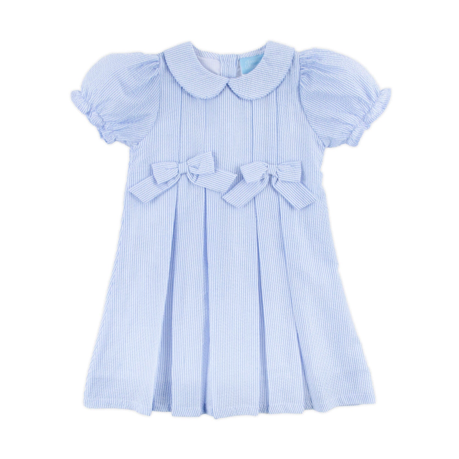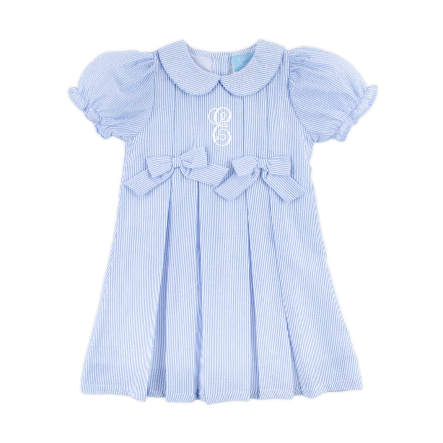 This Light Blue Stripe Molly Dress is perfect for Easter or any spring celebration. Designed in a light blue stripe fabric, it features bishop sleeves, a sweet collar, and two adorable front bows that add the cutest finishing touch.