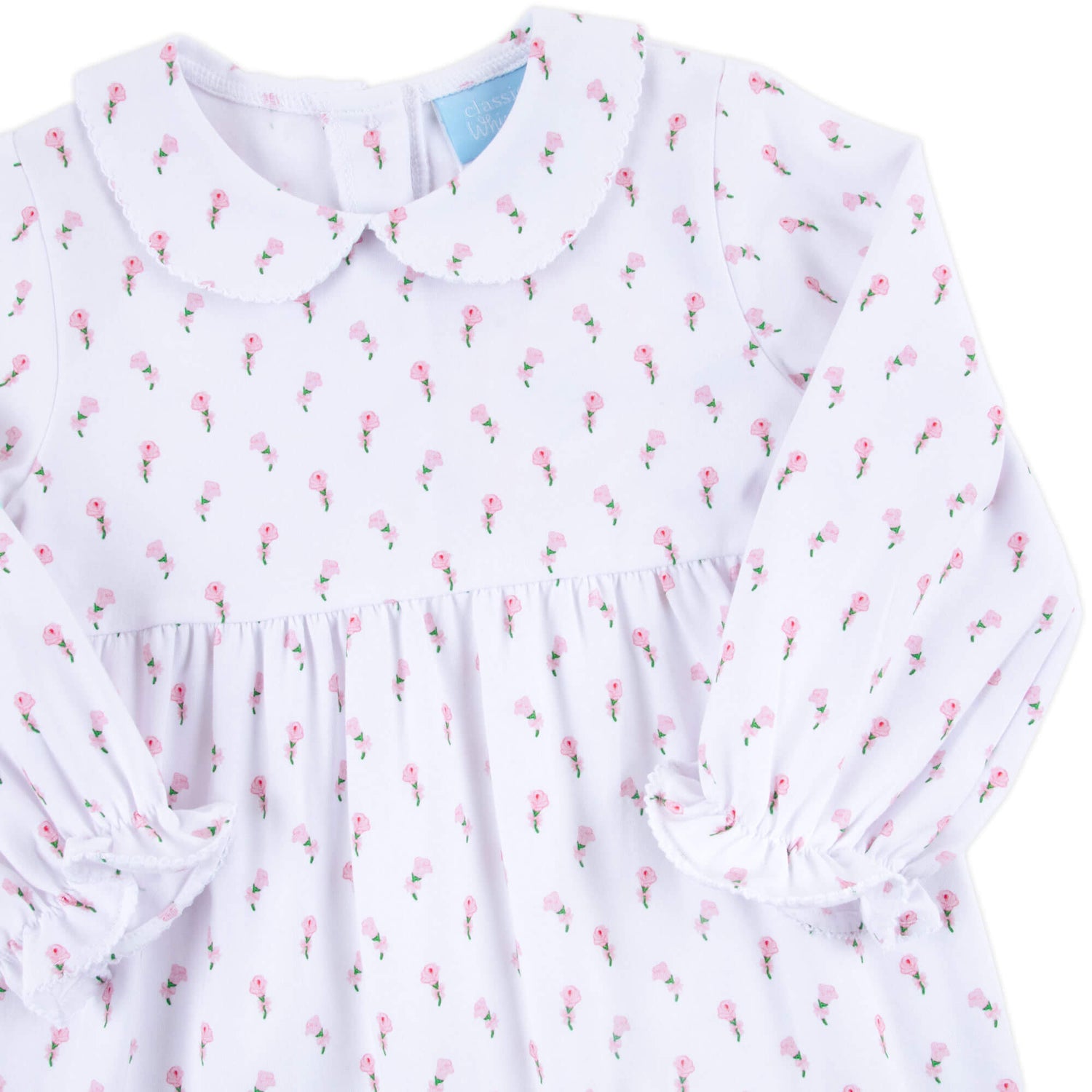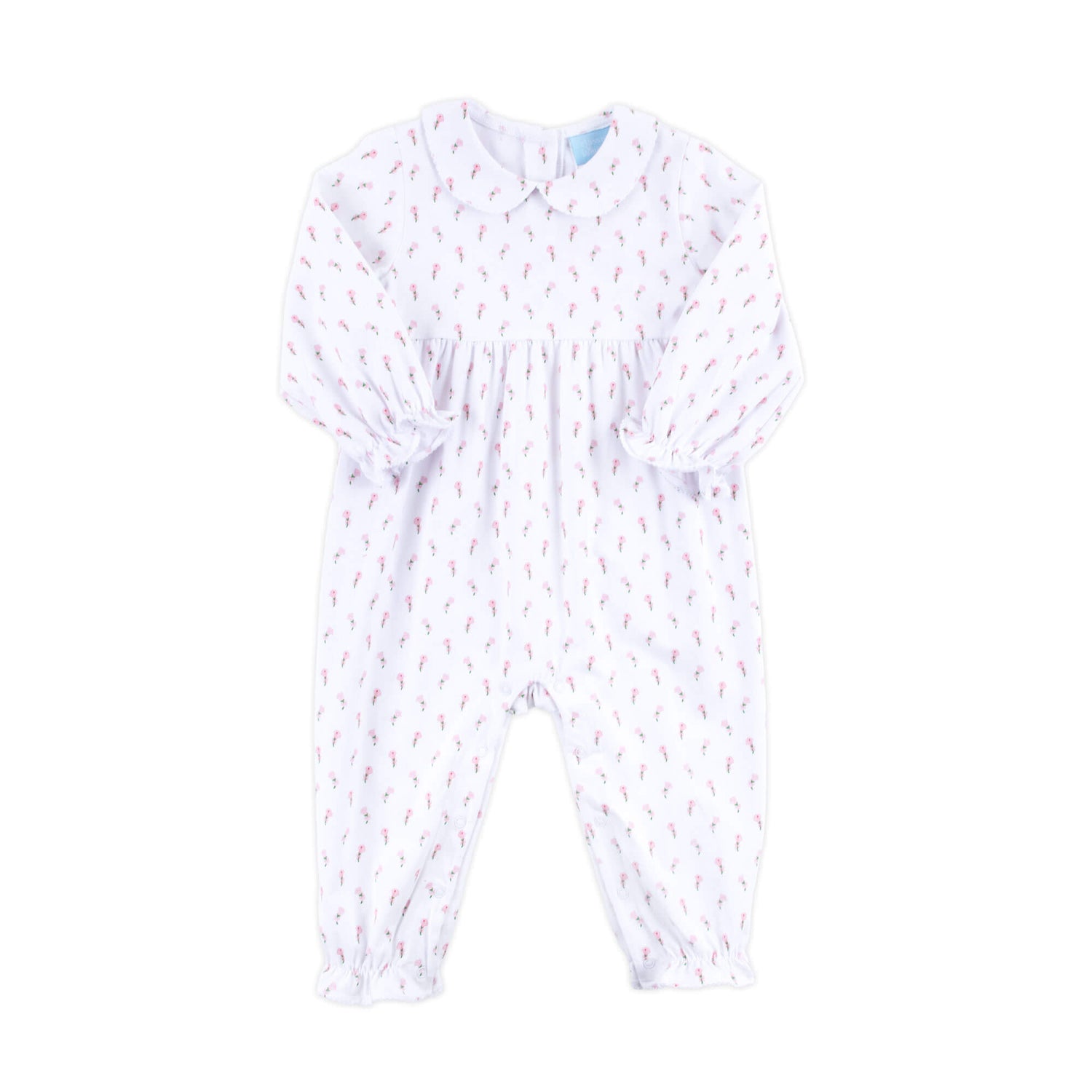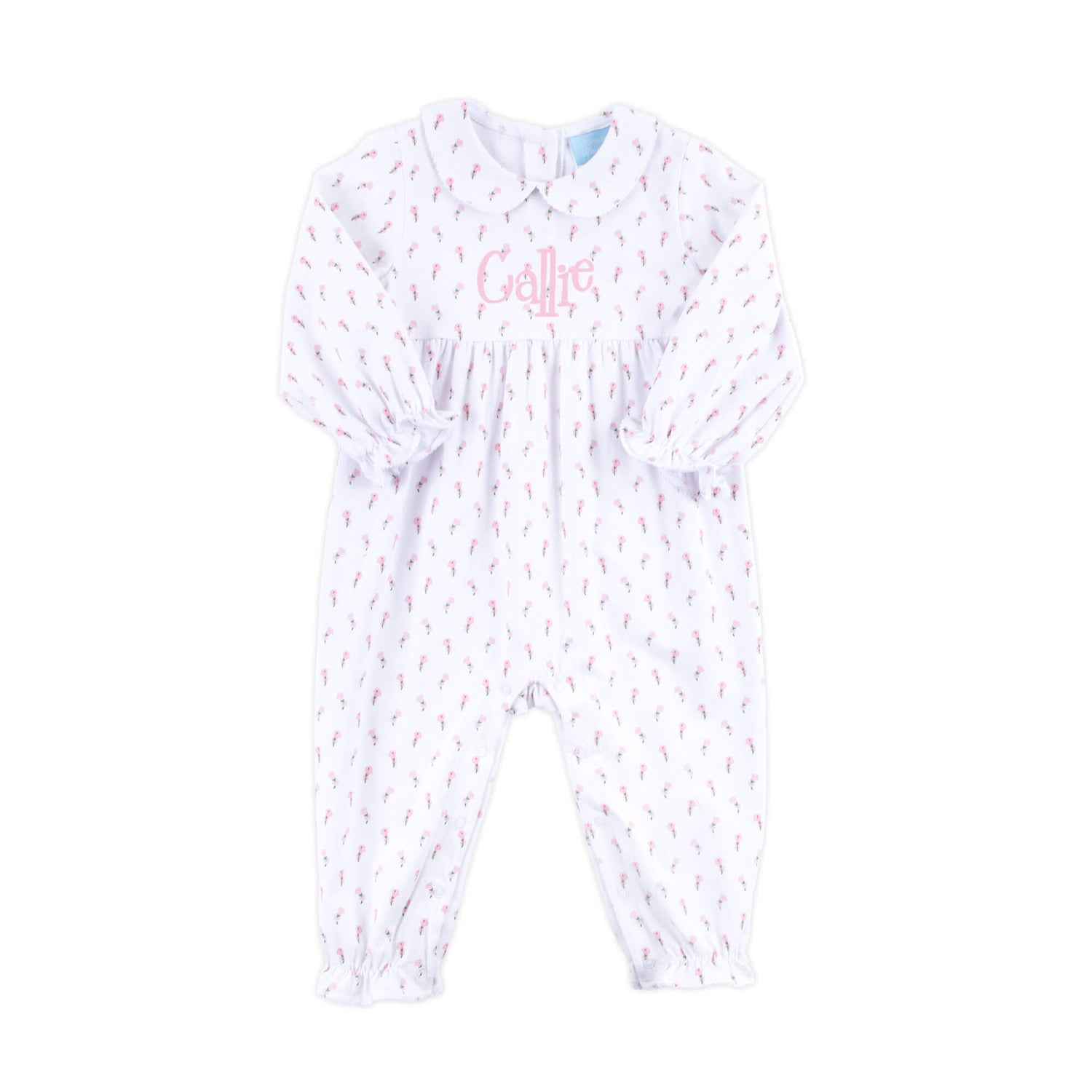 This Pink Rosebud Ruffle Romper is perfect for every season. Designed in a soft knit fabric with a sweet pink rosebud print, it features a charming collar and long bishop sleeves for a classic look. Snaps in stride make changes easy, and adding a monogram gives this darling outfit an extra special finishing touch.