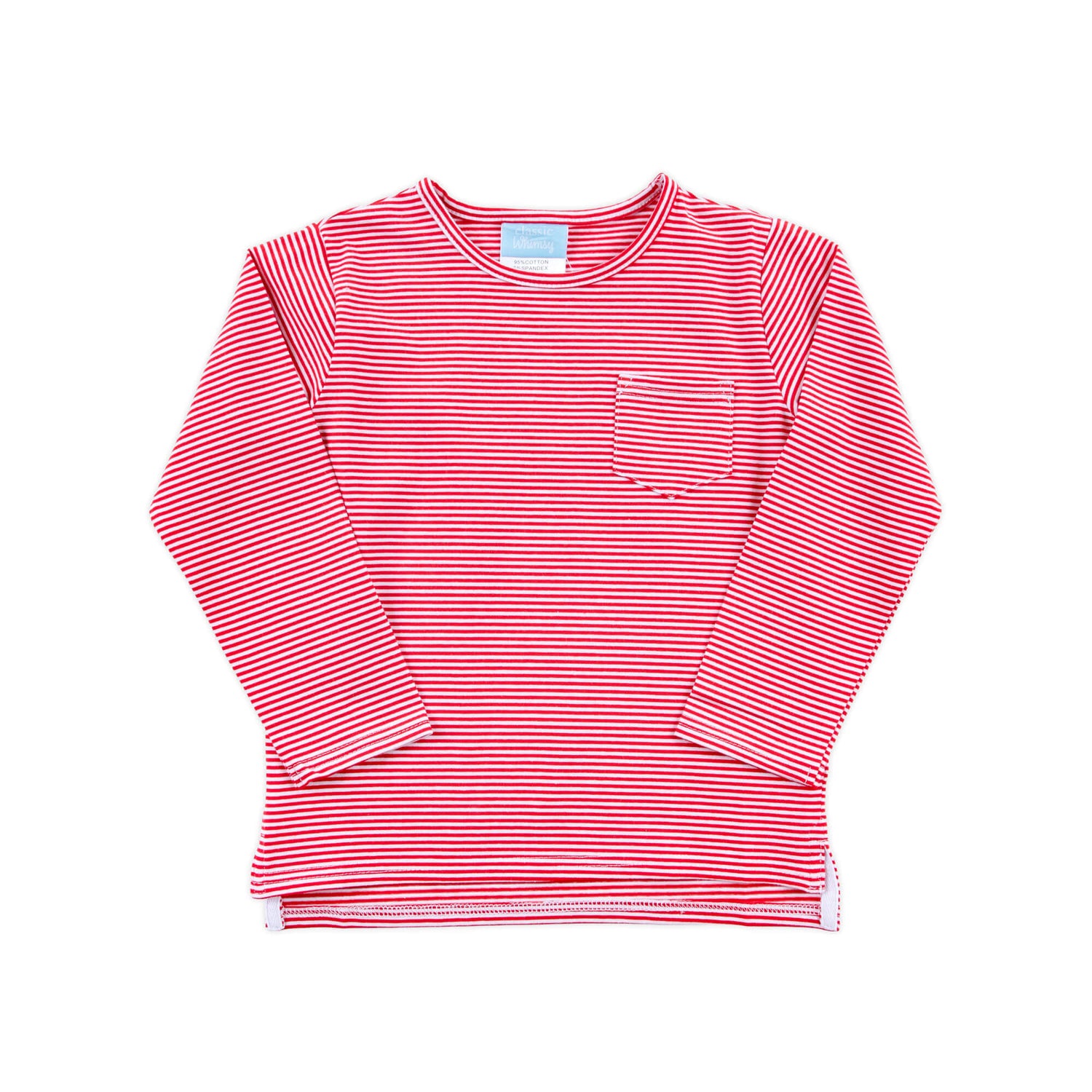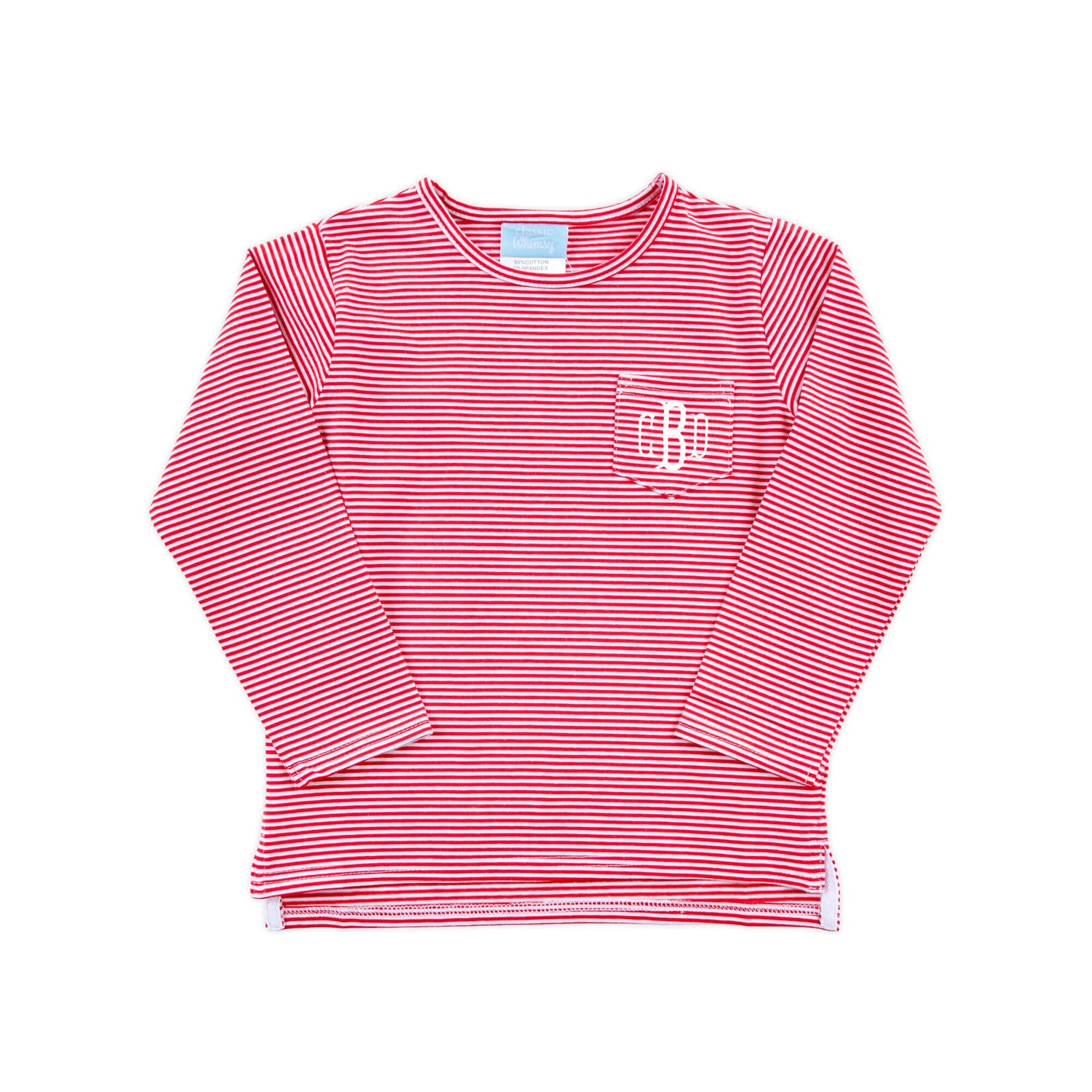 Your little one will adore our Red Stripe Long Sleeve Pocket Shirt! This knit stripe shirt features a side pocket and is perfect for everyday fun during the cooler fall and winter months. Great for mixing and matching with your favorite bottoms, it’s a comfy and cute choice for playtime and beyond. Make it extra special by adding a personalized monogram!