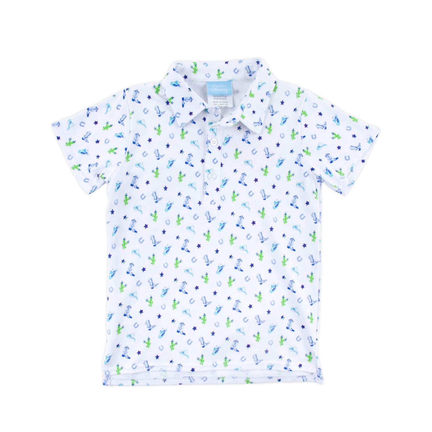 Howdy y’all! This Western Cowboy Blue Polo is a must have for your little one. This short sleeve polo features a playful blue western cowboy print with boots and cowboy hats for a charming touch. Add a monogram to make this look even more special.