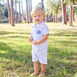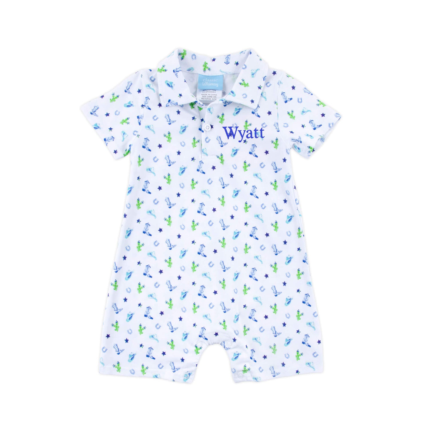 Howdy y’all! This Western Cowboy Blue Polo Romper is a must have for your little one. Designed with short sleeves, it features a playful blue western cowboy print with boots and cowboy hats for a charming touch. Snaps in stride make changes easy, and adding a monogram makes this look even more special.