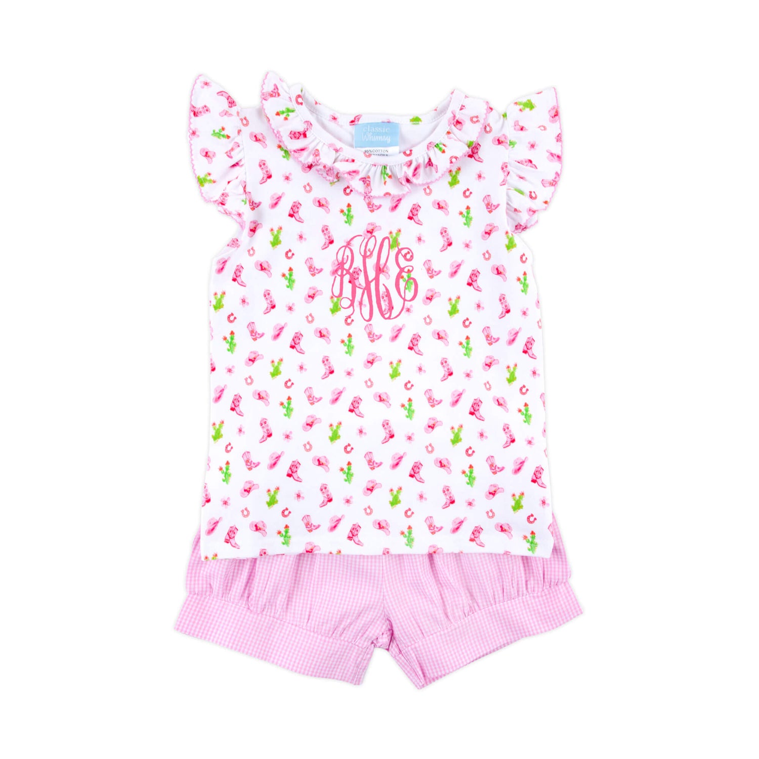 Howdy y’all! The Western Cowboy Pink Adalyn Short Set is a must have for your little one. This sweet top features a playful pink western cowboy print with boots and cowboy hats, finished with flutter sleeves for an extra charming touch. It is paired with gingham shorts with an easy pull on waistband. Add a monogram to make this look even more special.