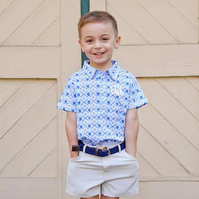 Your little baseball star will look adorable in our Baseball Star Polo! This knit short-sleeve polo features a playful baseball print, combining style and comfort for any occasion. Make it extra special by adding a monogram!