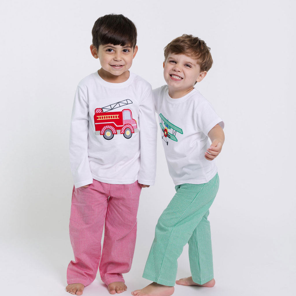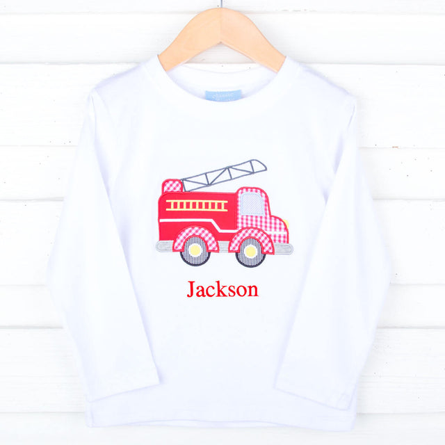 Your little firefighter will adore our Firefighter to the Rescue Shirt. With its vibrant red fire truck appliqué, this long sleeve white shirt is perfect for mixing and matching with your favorite bottoms. It's the ideal choice for playtime fun, comfort, and cuteness! Don't forget to personalize it by adding a name monogram below the appliqué.