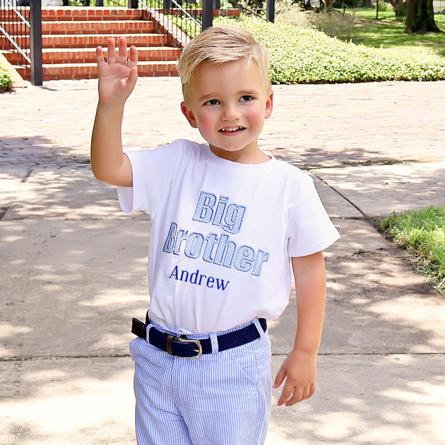 Your big boy will love showing off his new title in this Big Brother Blue Gingham Short Sleeve Shirt! Made from soft white knit, it features a bold blue "Big Brother" applique, perfect for celebrating his special role in style. Add a monogram for a personalized touch.