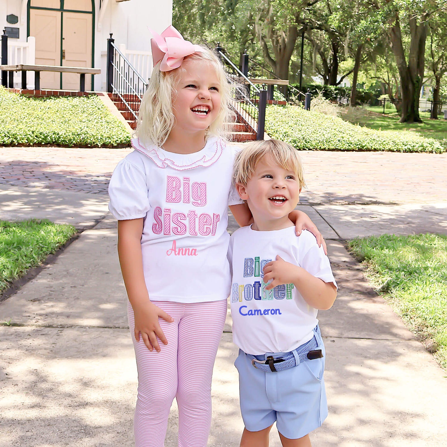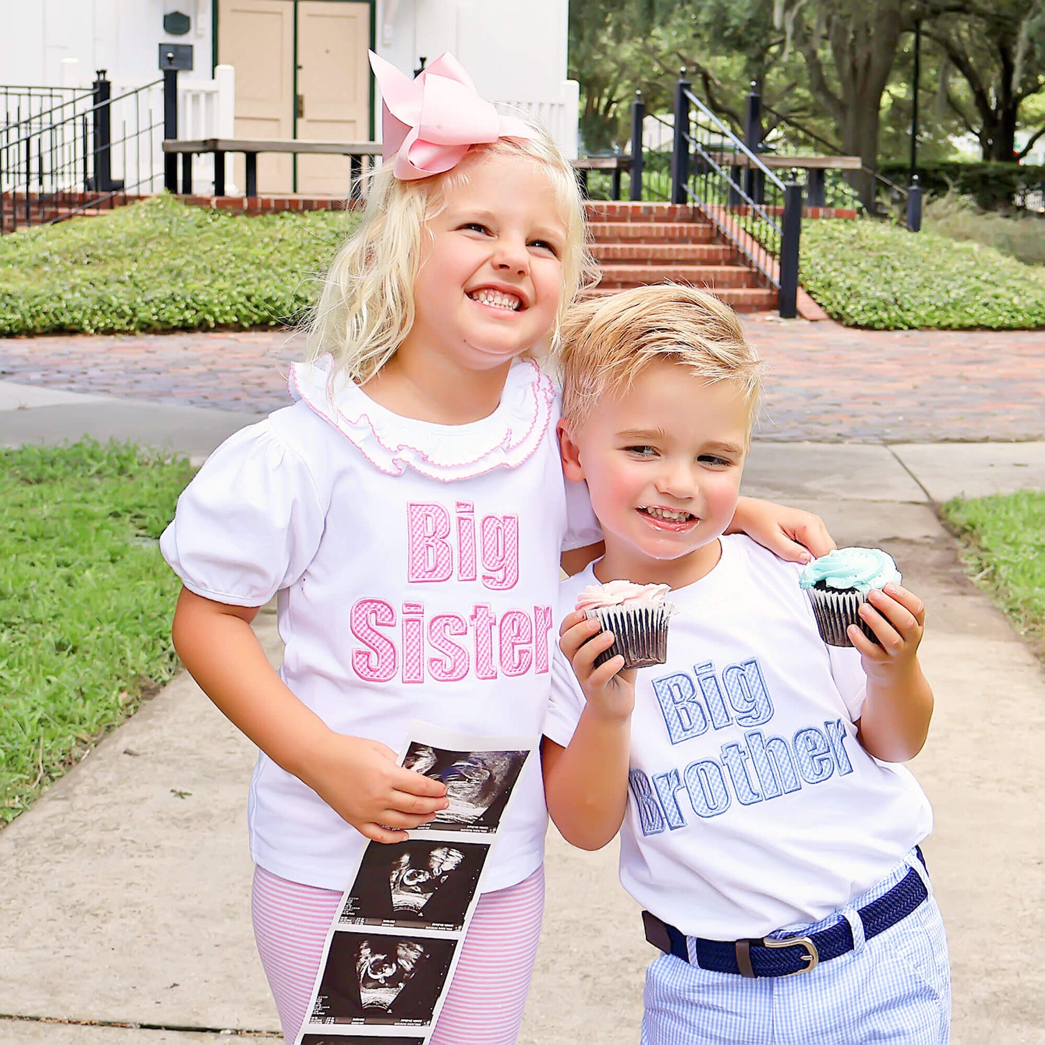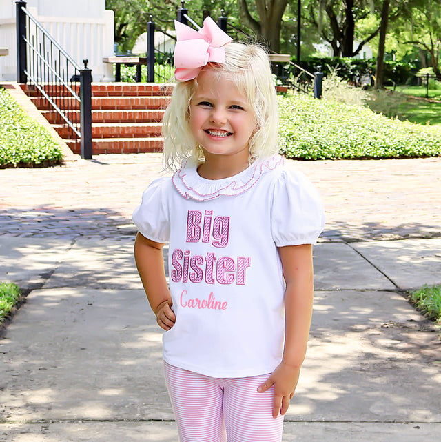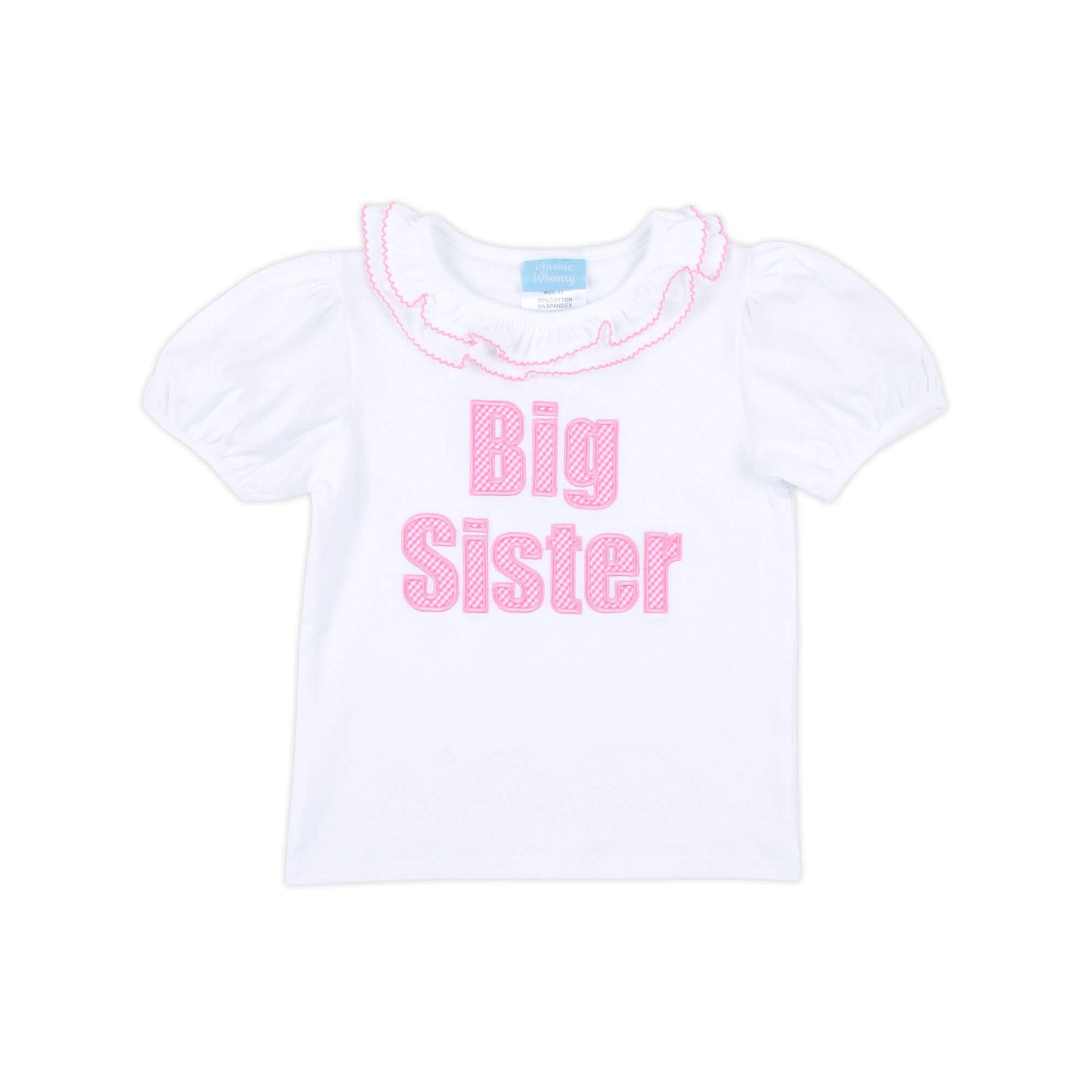 Your big girl will love showing off her new title in this Big Sister Pink Gingham Ruffle Top! Made from soft white knit, it features a cute ruffle collar with pink picot trim and a bold "Big Sister" applique, perfect for celebrating her special role in style.